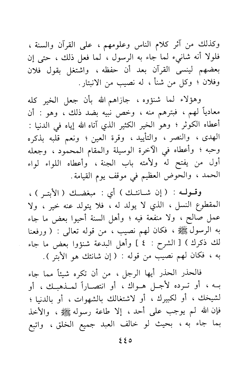 وقولة: {إِنَّ شَانِئَكَ} أي: مبغضك. {الأَبْتَرُ (: المقطوع النسل، الذي لا يولد له، فلا يتولد عنه خير، ولا عمل صالح، ولا منفعة فيه; وأهل السنة أحيوا بعض ما جاء به الرسول صلى الله عليه وسلم فكان لهم نصيب من قوله تعالى: {وَرَفَعْنَا لَكَ ذِكْرَكَ} [سورة الشرح آية: 4] ؛ وأهل البدعة شنؤوا بعض ما جاء به، فكان لهم نصيب من قوله: {إِنَّ شَانِئَكَ هُوَ الأَبْتَرُ} [سورة الكوثر آية: 3] .