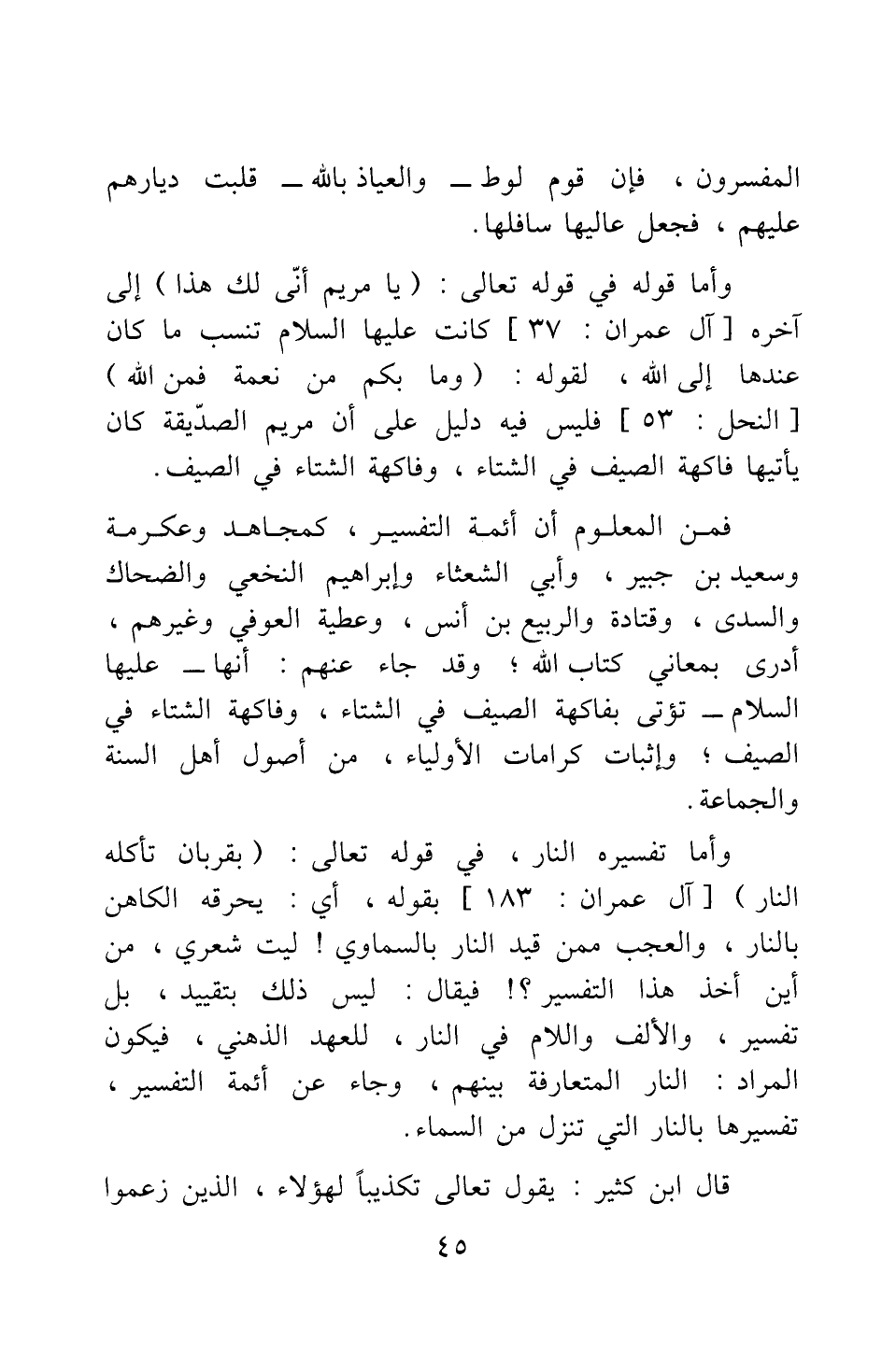 فمن المعلوم أن أئمة التفسير، كمجاهد وعكرمة وسعيد بن جبير، وأبي الشعثاء وإبراهيم النخعي والضحاك والسدي، وقتادة والربيع بن أنس، وعطية العوفي وغيرهم، أدرى بمعاني كتاب الله ; وقد جاء عنهم: أنها - عليها السلام - تؤتى بفاكهة الصيف في الشتاء، وفاكهة الشتاء في الصيف ; وإثبات كرامات الأولياء من أصول أهل السنة والجماعة.