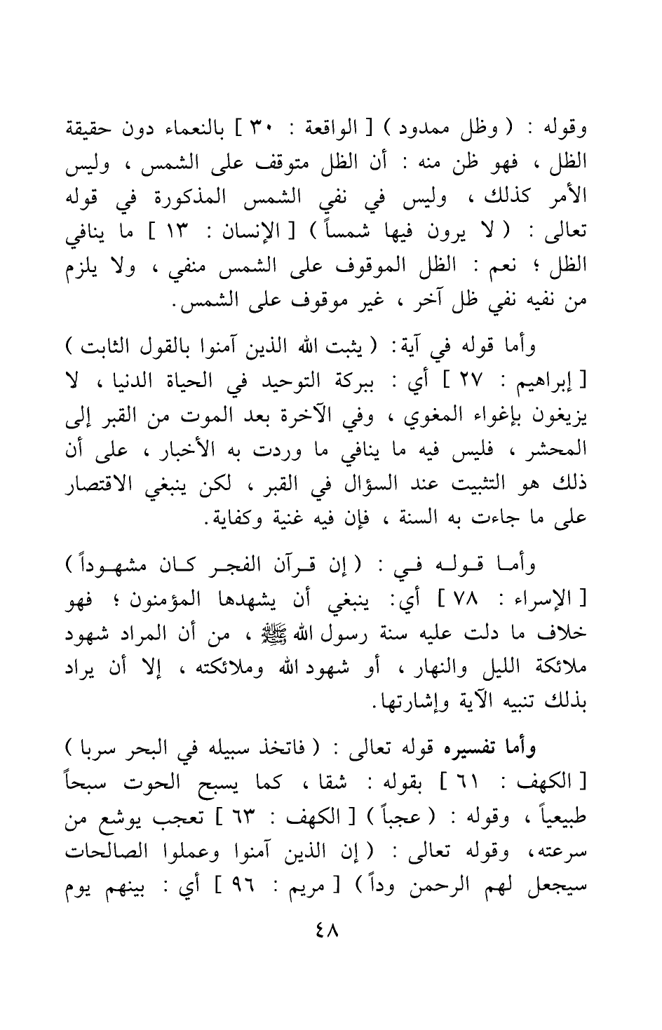 وقوله: {وَظِلٍّ مَمْدُودٍ} [سورة الواقعة آية: 30] بالنعماء دون حقيقة الظل، فهو ظن منه أن الظل متوقف على الشمس، وليس الأمر كذلك، وليس في نفي الشمس المذكورة في قوله تعالى: {لا يَرَوْنَ فِيهَا شَمْساً} [سورة الإنسان آية: 13] ما ينافي الظل; نعم: الظل الموقوف على الشمس منفي، ولا يلزم من نفيه نفي ظل آخر غير موقوف على الشمس. وأما قوله في آية: {يُثَبِّتُ اللَّهُ الَّذِينَ آمَنُوا بِالْقَوْلِ الثَّابِتِ} [سورة إبراهيم آية: 27] أي: ببركة التوحيد في الحياة الدنيا، لا يزيغون بإغواء المغوي، وفي الآخرة بعد الموت من القبر إلى المحشر، فليس فيه ما ينافي ما وردت به الأخبار، على أن ذلك هو التثبيت عند السؤال في القبر، لكن ينبغي الاقتصار على ما جاءت به السنة، فإن فيه غنية وكفاية.