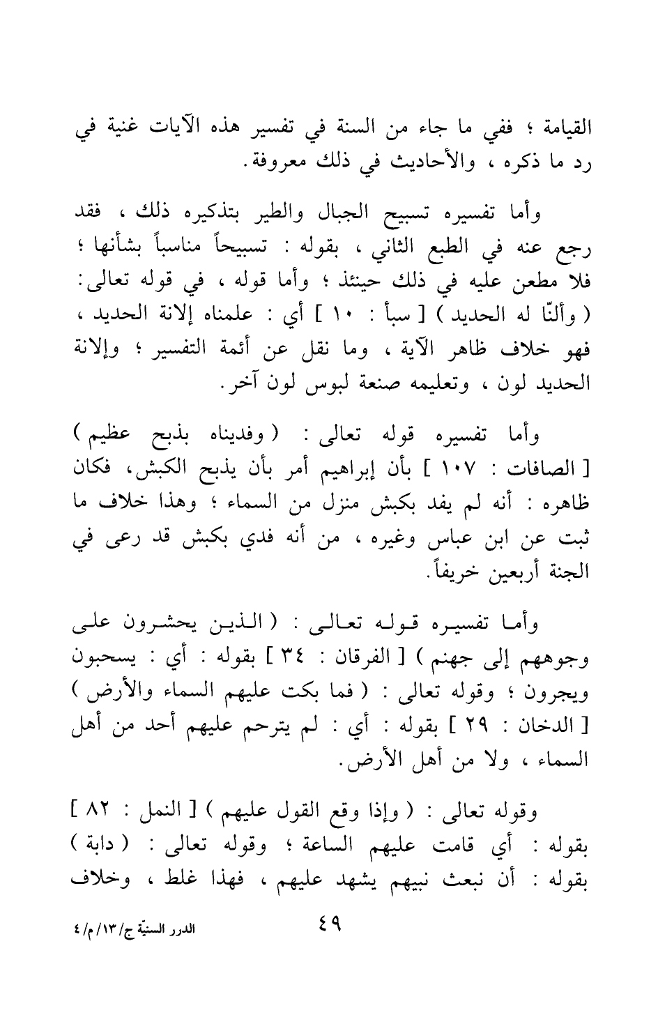 وأما تفسيره تسبيح الجبال والطير بتذكيره ذلك، فقد رجع عنه في الطبع الثاني، بقوله: تسبيحا مناسبا بشأنها ; فلا مطعن عليه في ذلك حينئذ. وأما قوله، في قوله تعالى: {وَأَلَنَّا لَهُ الْحَدِيدَ} [سورة سبأ آية: 10] أي: علمناه إلانة الحديد، فهو خلاف ظاهر الآية، وما نقل عن أئمة التفسير ; وإلانة الحديد لون، وتعليمه صنعة لبوس لون آخر.
