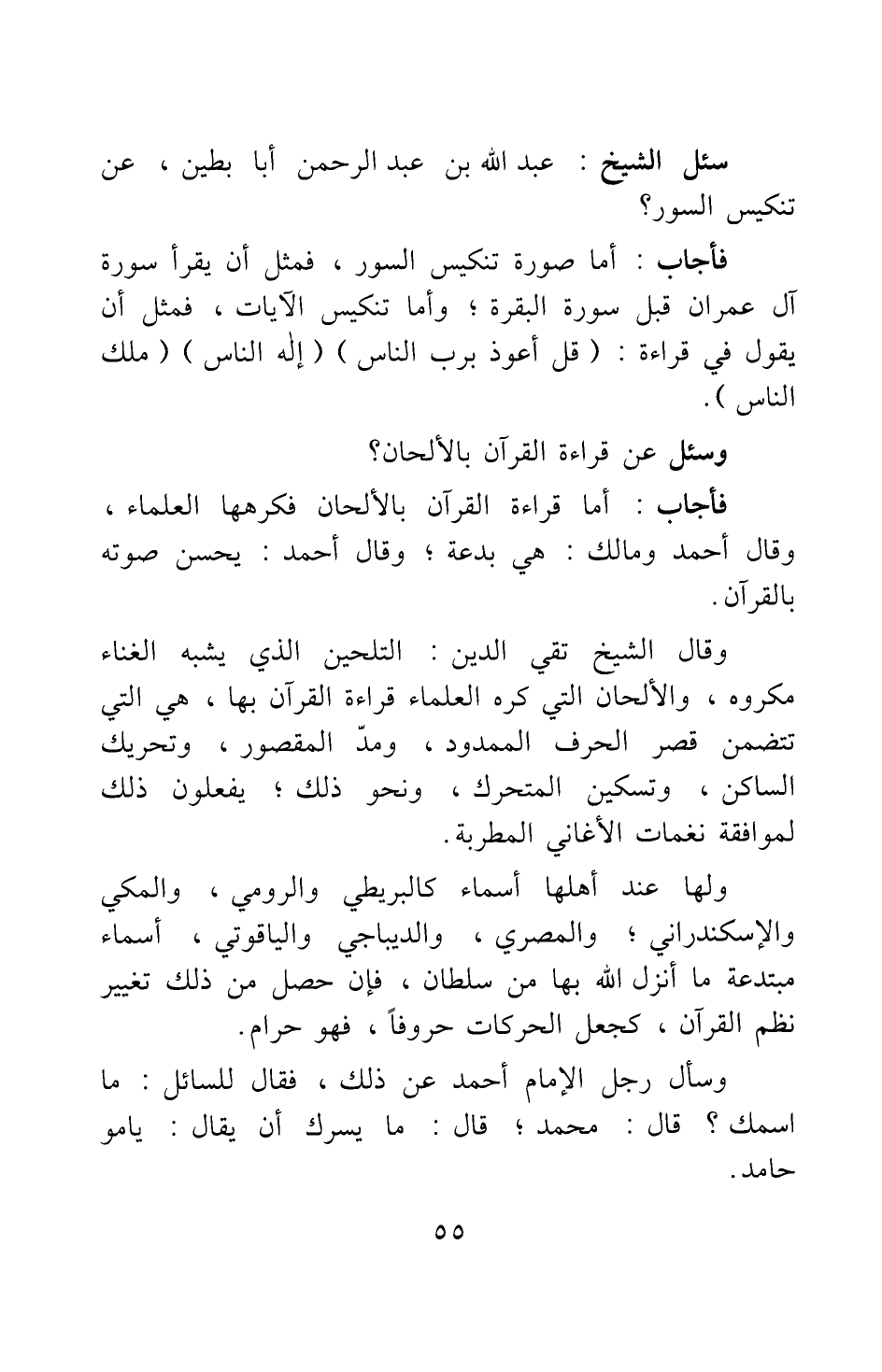 وقال الشيخ تقي الدين: التلحين الذي يشبه الغناء مكروه، والألحان التي كره العلماء قراءة القرآن بها هي التي تتضمن قصر الحرف الممدود، ومد المقصور، وتحريك الساكن، وتسكين المتحرك، ونحو ذلك ; يفعلون ذلك لموافقة نغمات الأغاني المطربة. ولها عند أهلها أسماء كالبريطي والرومي، والمكي، والإسكندراني ; والمصري، والديباجي، والياقوتي، أسماء مبتدعة ما أنزل الله بها من سلطان، فإن حصل من ذلك تغيير نظم القرآن، كجعل الحركات حروفا، فهو حرام. وسأل رجل الإمام أحمد عن ذلك، فقال للسائل: ما اسمك؟ قال: محمد ; قال: ما يسرك أن يقال: يامو حامد.