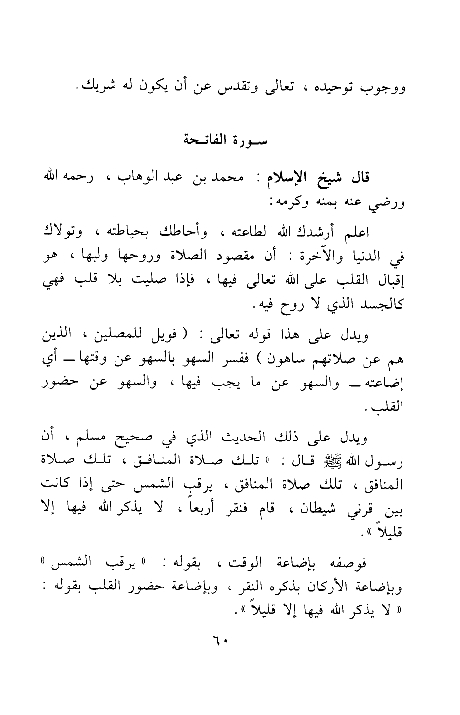 قال شيخ الإسلام: محمد بن عبد الوهاب، رحمه الله ورضي عنه بمنه وكرمه: اعلم أرشدك الله لطاعته، وأحاطك بحياطته، وتولاك في الدنيا والآخرة: أن مقصود الصلاة وروحها ولبها، هو إقبال القلب على الله تعالى فيها، فإذا صليت بلا قلب فهي كالجسد الذي لا روح فيه.
