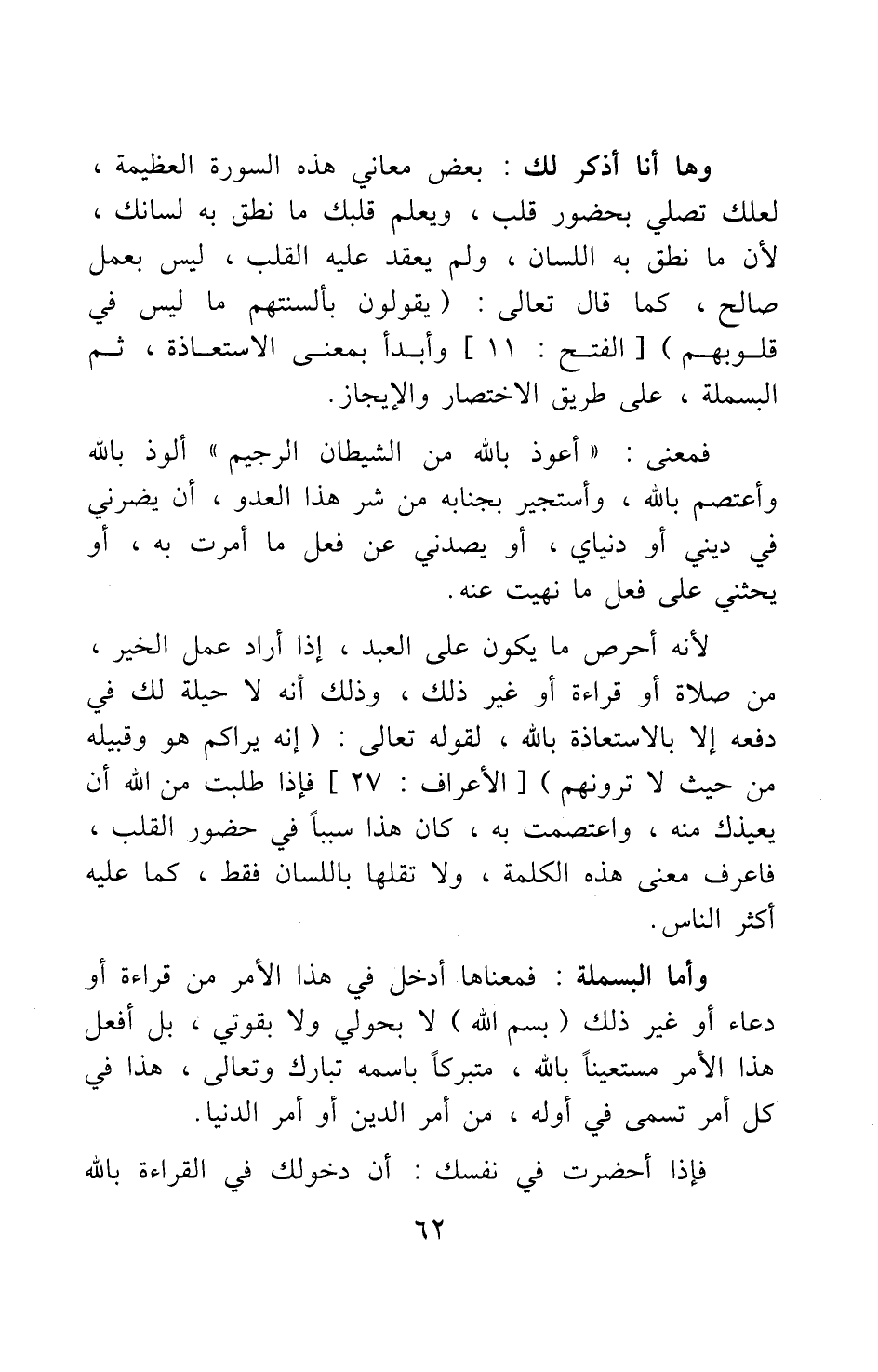 وها أنا أذكر لك بعض معاني هذه السورة العظيمة، لعلك تصلي بحضور قلب، ويعلم قلبك ما نطق به لسانك; لأن ما نطق به اللسان ولم يعقد عليه القلب ليس بعمل صالح، كما قال تعالى: {يَقُولُونَ بِأَلْسِنَتِهِمْ مَا لَيْسَ فِي قُلُوبِهِمْ} [سورة الفتح آية: 11] وأبدأ بمعنى الاستعاذة، ثم البسملة، على طريق الاختصار والإيجاز.
