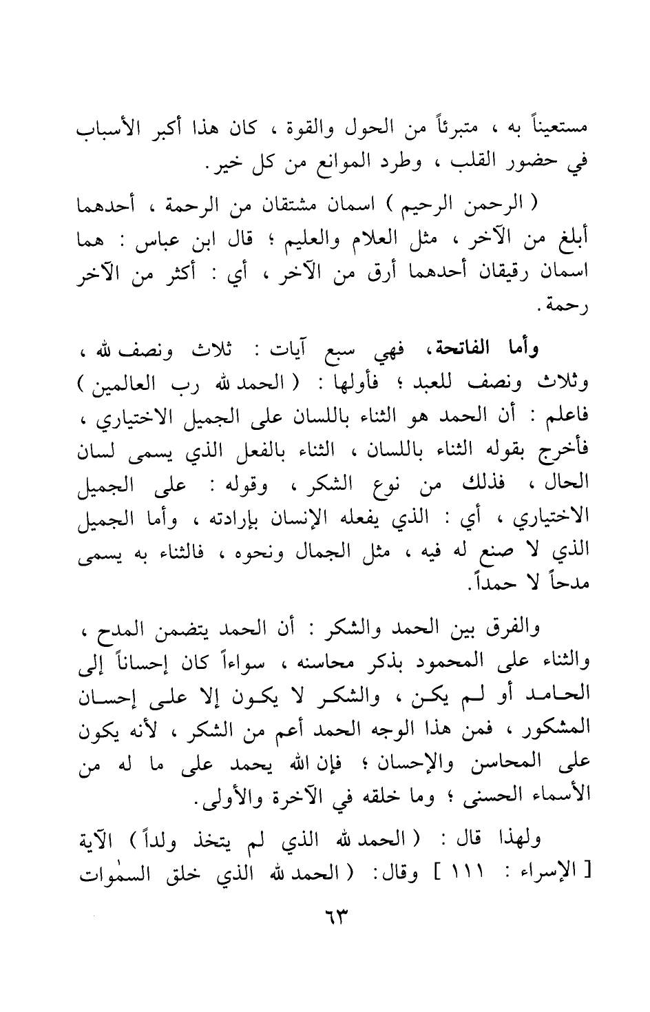 وأما الفاتحة، فهي سبع آيات: ثلاث ونصف لله، وثلاث ونصف للعبد ; فأولها: {الْحَمْدُ لِلَّهِ رَبِّ الْعَالَمِينَ} [سورة الفاتحة آية: 2] .