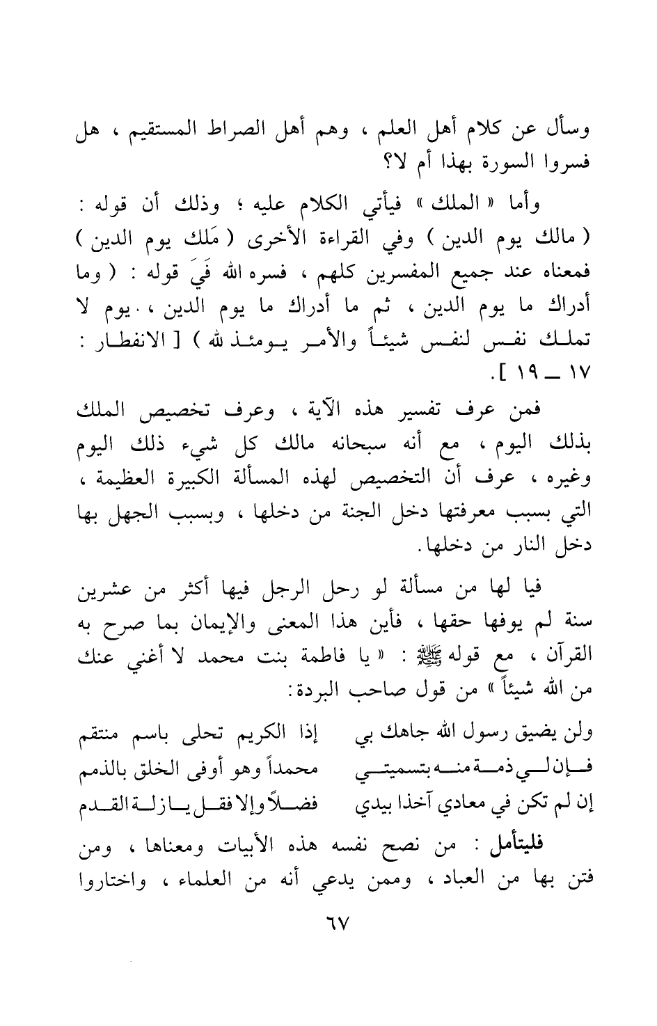 وسأل عن كلام أهل العلم، وهم أهل الصراط المستقيم، هل فسروا السورة بهذا أم لا؟ وأما " الملك " فيأتي الكلام عليه ; وذلك أن قوله: {مَالِكِ يَوْمِ الدِّينِ} [سورة الفاتحة آية: 4] وفي القراءة الأخرى {مَالِكِ يَوْمِ الدِّينِ} فمعناه عند جميع المفسرين كلهم، فسره الله في قوله: {وَمَا أَدْرَاكَ مَا يَوْمُ الدِّينِ ثُمَّ مَا أَدْرَاكَ مَا يَوْمُ الدِّينِ يَوْمَ لا تَمْلِكُ نَفْسٌ لِنَفْسٍ شَيْئاً وَالْأَمْرُ يَوْمَئِذٍ لِلَّهِ} [سورة الإنفطار آية: 17-18-19] فمن عرف تفسير هذه الآية، وعرف تخصيص الملك بذلك اليوم، مع أنه سبحانه مالك كل شيء ذلك اليوم وغيره، عرف أن التخصيص لهذه المسألة الكبيرة العظيمة، التي بسبب معرفتها دخل الجنة من دخلها، وبسبب الجهل بها دخل النار من دخلها.