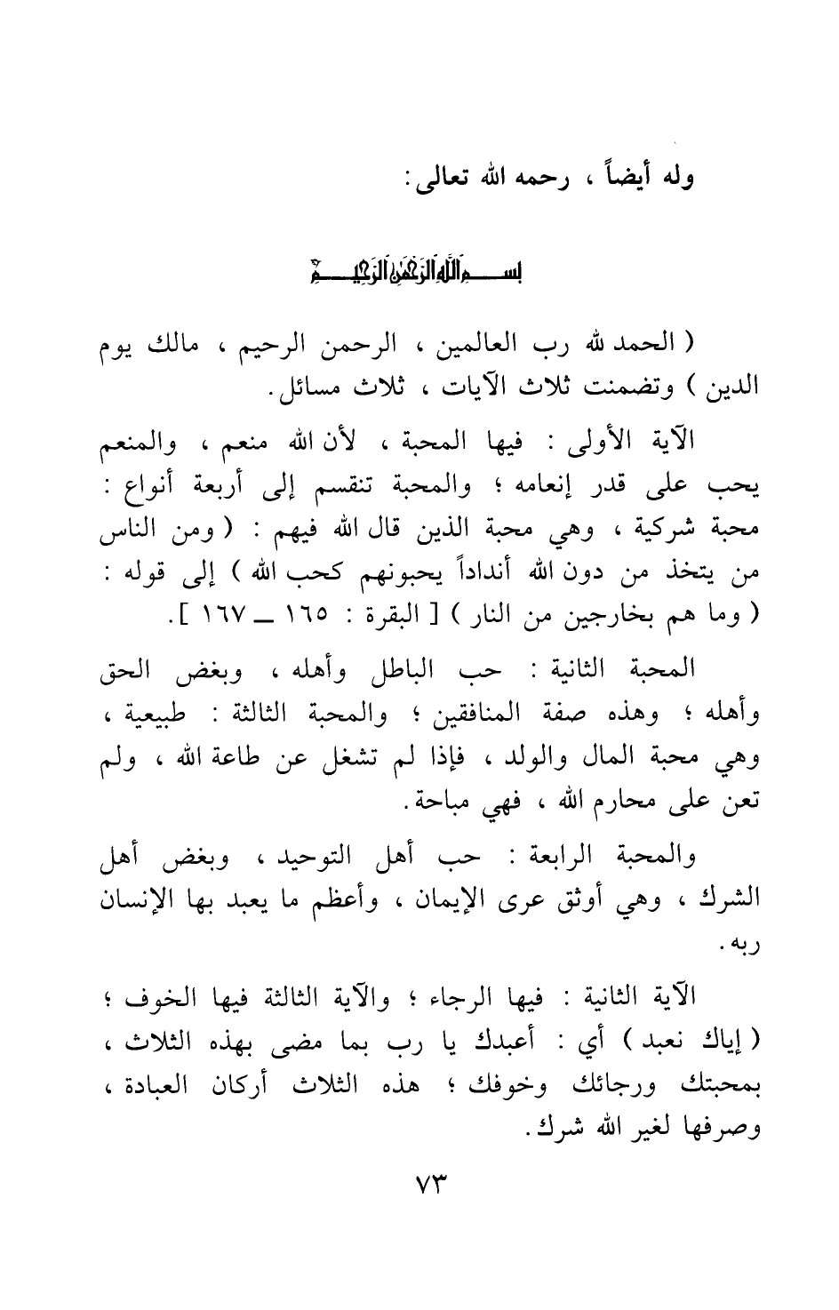 [سورة الفاتحة آية: 2-3-4] وتضمنت ثلاث الآيات ثلاث مسائل: