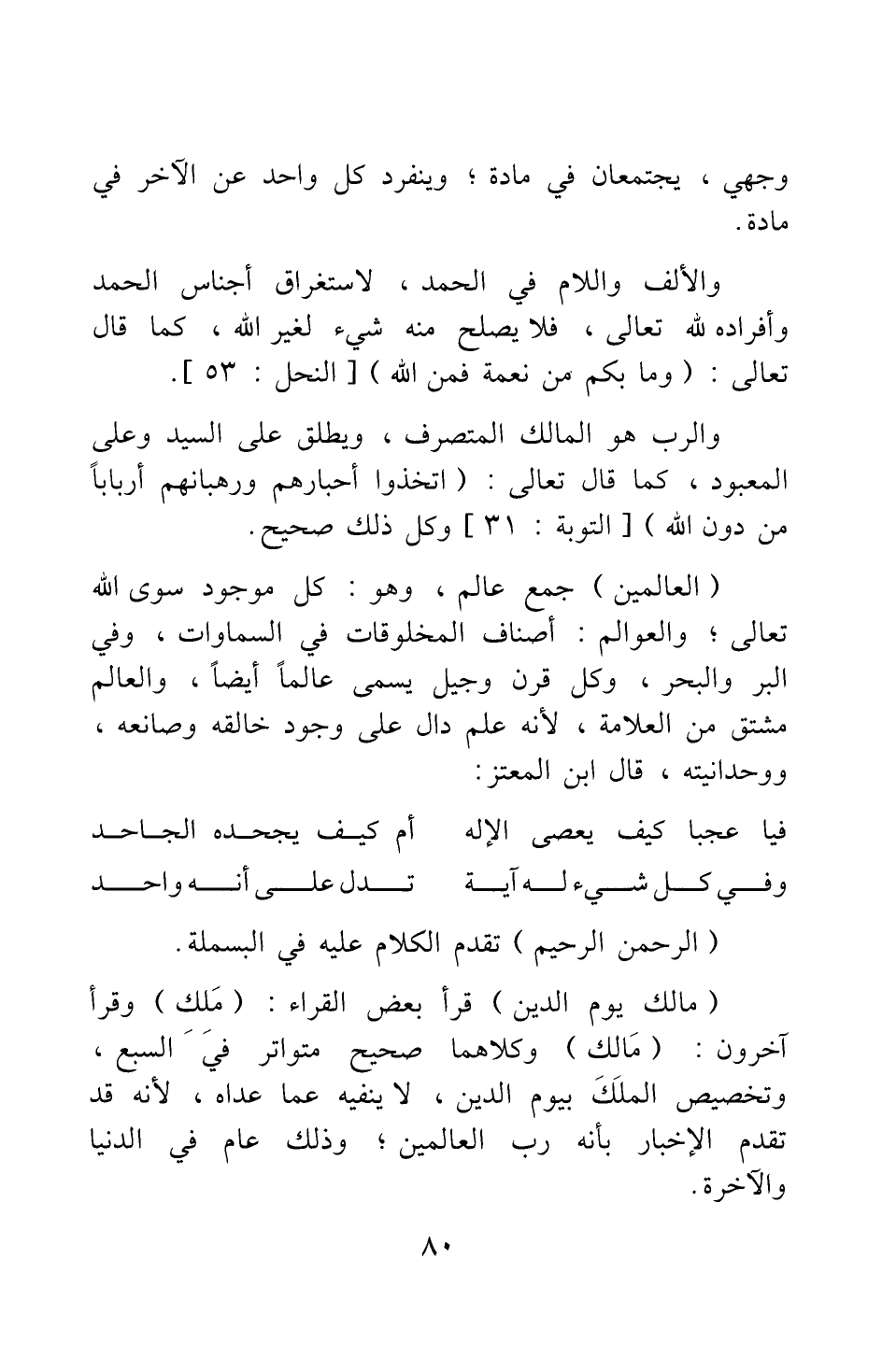 وجهي، يجتمعان في مادة ; وينفرد كل واحد عن الآخر في مادة. والألف واللام في الحمد لاستغراق أجناس الحمد وأفراده لله تعالى، فلا يصلح منه شيء لغير الله، كما قال تعالى: {وَمَا بِكُمْ مِنْ نِعْمَةٍ فَمِنَ اللَّهِ} [سورة النحل آية: 53] . والرب هو المالك المتصرف، ويطلق على السيد وعلى المعبود، كما قال تعالى: {اتَّخَذُوا أَحْبَارَهُمْ وَرُهْبَانَهُمْ أَرْبَاباً مِنْ دُونِ اللَّهِ} [سورة التوبة آية: 31] ، وكل ذلك صحيح. {الْعَالَمِينَ} : جمع عالم، وهو: كل موجود سوى الله تعالى ; والعوالم: أصناف المخلوقات في السماوات، وفي البر والبحر، وكل قرن وجيل يسمى عالما أيضا، والعالم مشتق من العلامة ; لأنه علم دال على وجود خالقه وصانعه، ووحدانيته، قال ابن المعتز: