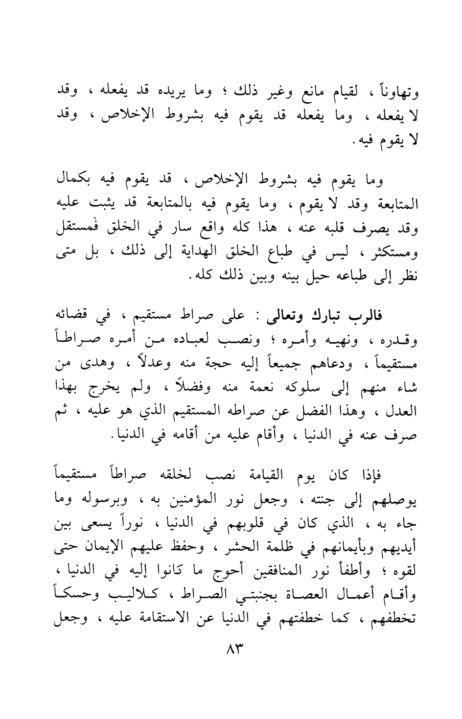 فالرب تبارك وتعالى على صراط مستقيم في قضائه وقدره، ونهيه وأمره; ونصب لعباده من أمره صراطا مستقيما، ودعاهم جميعا إليه حجة منه وعدلا، وهدى من شاء منهم إلى سلوكه نعمة منه وفضلا، ولم يخرج بهذا العدل وهذا الفضل عن صراطه المستقيم الذي هو عليه، ثم صرف عنه في الدنيا، وأقام عليه من أقامه في الدنيا.