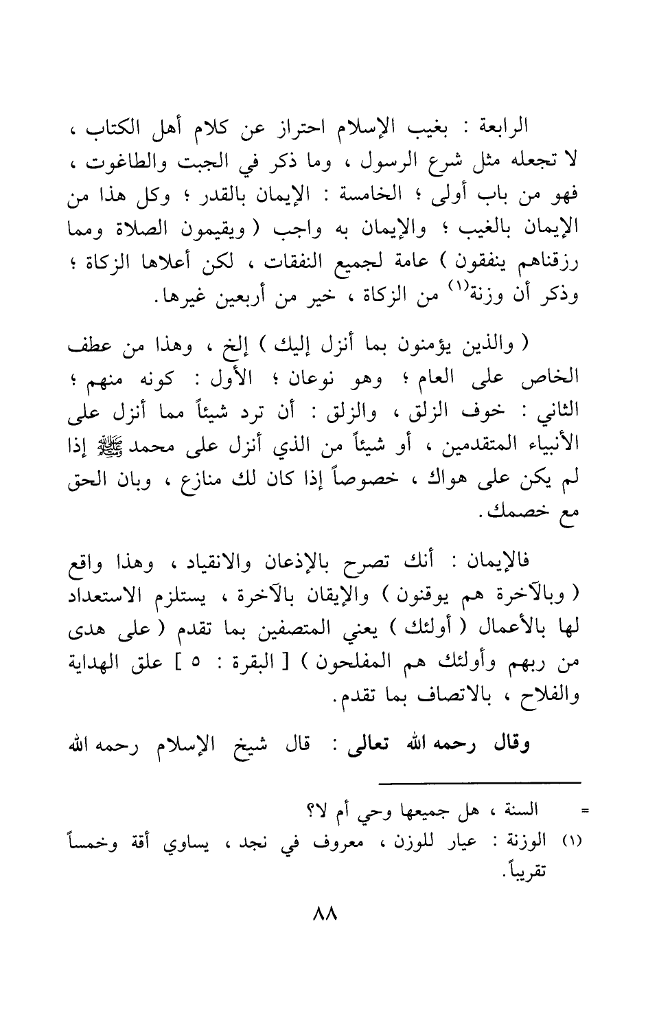 الخامسة: الإيمان بالقدر ; وكل هذا من الإيمان بالغيب، والإيمان به واجب {وَيُقِيمُونَ الصَّلاةَ وَمِمَّا رَزَقْنَاهُمْ يُنْفِقُونَ} : عامة لجميع النفقات، لكن أعلاها الزكاة، وذكر أن وزنة 1 من الزكاة خير من أربعين غيرها. {وَالَّذِينَ يُؤْمِنُونَ بِمَا أُنْزِلَ إِلَيْكَ} [سورة البقرة آية: 3] إلخ، وهذا من عطف الخاص على العام ; وهو نوعان: