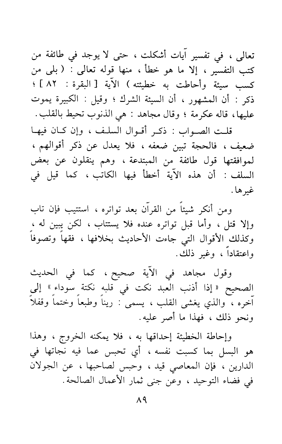 تعالى، في تفسير آيات أشكلت، حتى لا يوجد في طائفة من كتب التفسير، إلا ما هو خطأ، منها قوله تعالى: {بَلَى مَنْ كَسَبَ سَيِّئَةً وَأَحَاطَتْ بِهِ خَطِيئَتُهُ} [سورة البقرة آية: 81] الآية ; ذكر: أن المشهور أن السيئة: الشرك ; وقيل: الكبيرة يموت عليها، قاله عكرمة ; وقال مجاهد: هي الذنوب تحيط بالقلب.