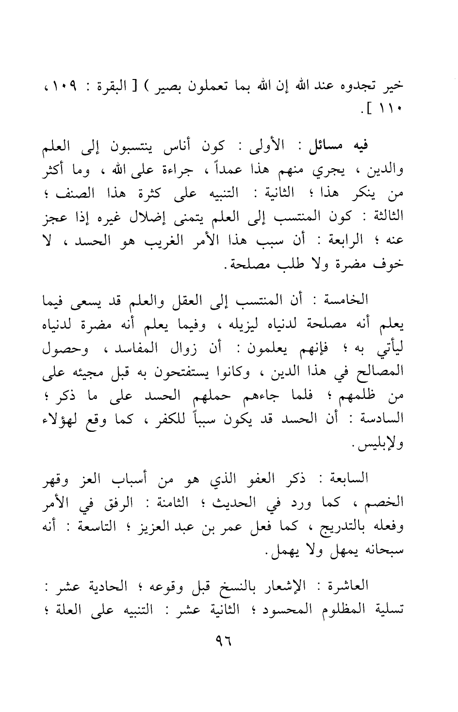 الخامسة: أن المنتسب إلى العقل والعلم قد يسعى فيما يعلم أنه مصلحة لدنياه ليزيله، وفيما يعلم أنه مضرة لدنياه ليأتي به ; فإنهم يعلمون أن زوال المفاسد، وحصول المصالح في هذا الدين، وكانوا يستفتحون به قبل مجيئه على من ظلمهم ; فلما جاءهم حملهم الحسد على ما ذكر.