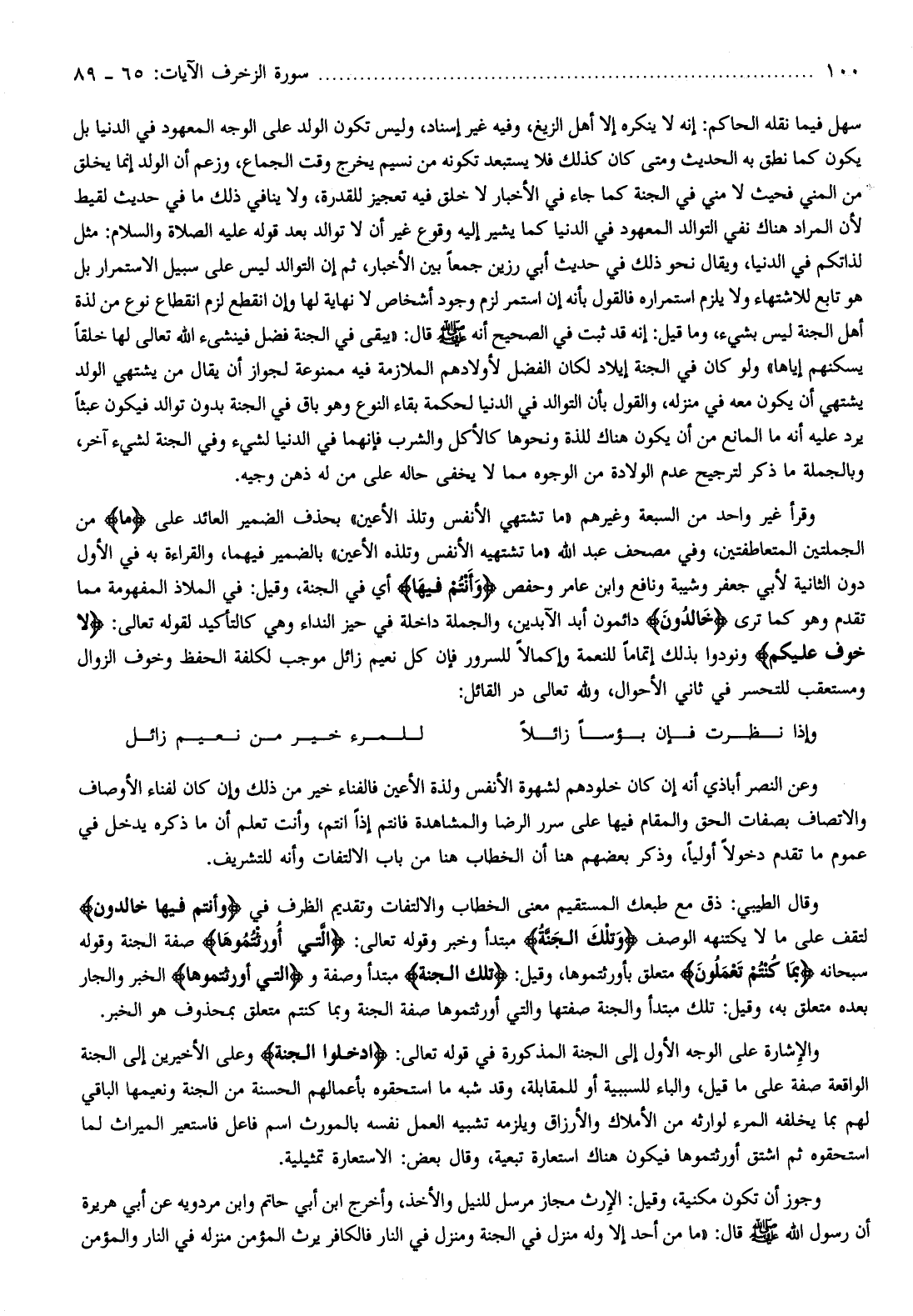 وقال الطيبي: ذق مع طبعك المستقيم معنى الخطاب والالتفات وتقديم الظرف في وَأَنْتُمْ فِيها خالِدُونَ لتقف على ما لا يكتنهه الوصف وَتِلْكَ الْجَنَّةُ مبتدأ وخبر وقوله تعالى: الَّتِي أُورِثْتُمُوها صفة الجنة وقوله سبحانه بِما كُنْتُمْ تَعْمَلُونَ متعلق بأورثتموها، وقيل: تِلْكَ الْجَنَّةُ مبتدأ وصفة والَّتِي أُورِثْتُمُوها الخبر والجار بعده متعلق به، وقيل: تلك مبتدأ والجنة صفتها والتي أورثتموها صفة الجنة وبما كنتم متعلق بمحذوف هو الخبر.