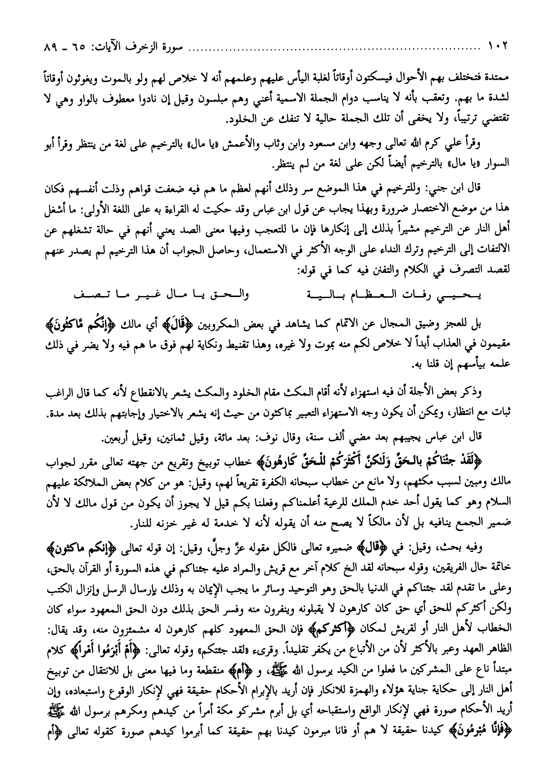 لَقَدْ جِئْناكُمْ بِالْحَقِّ وَلكِنَّ أَكْثَرَكُمْ لِلْحَقِّ كارِهُونَ خطاب توبيخ وتقريع من جهته تعالى مقرر لجواب مالك ومبين لسبب مكثهم، ولا مانع من خطاب سبحانه الكفرة تقريعا لهم، وقيل: هو من كلام بعض الملائكة عليهم السلام وهو كما يقول أحد خدم الملك للرعية أعلمناكم وفعلنا بكم قيل لا يجوز أن يكون من قول مالك لا لأن ضمير الجمع ينافيه بل لأن مالكا لا يصح منه أن يقوله لأنه لا خدمة له غير خزنه للنار.