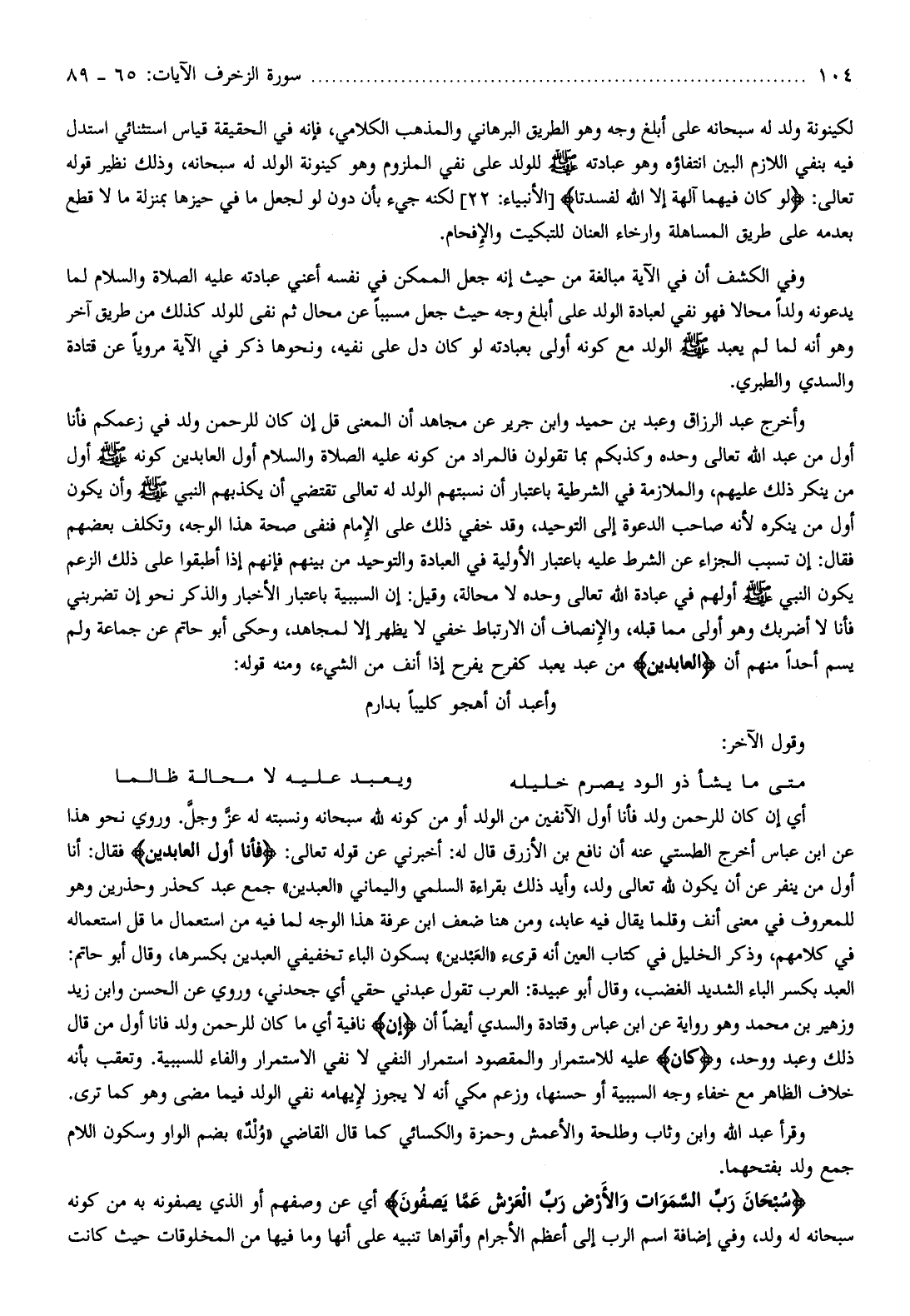 لكينونة ولد له سبحانه على أبلغ وجه وهو الطريق البرهاني والمذهب الكلامي، فإنه في الحقيقة قياس استثنائي استدل فيه بنفي اللازم البين انتفاؤه وهو عبادته صلّى الله عليه وسلّم للولد على نفي الملزوم وهو كينونة الولد له سبحانه، وذلك نظير قوله تعالى: لَوْ كانَ فِيهِما آلِهَةٌ إِلَّا اللَّهُ لَفَسَدَتا [الأنبياء: 22] لكنه جيء بأن دون لو لجعل ما في حيزها بمنزلة ما لا قطع بعدمه على طريق المساهلة وإرخاء العنان للتبكيت والإفحام.