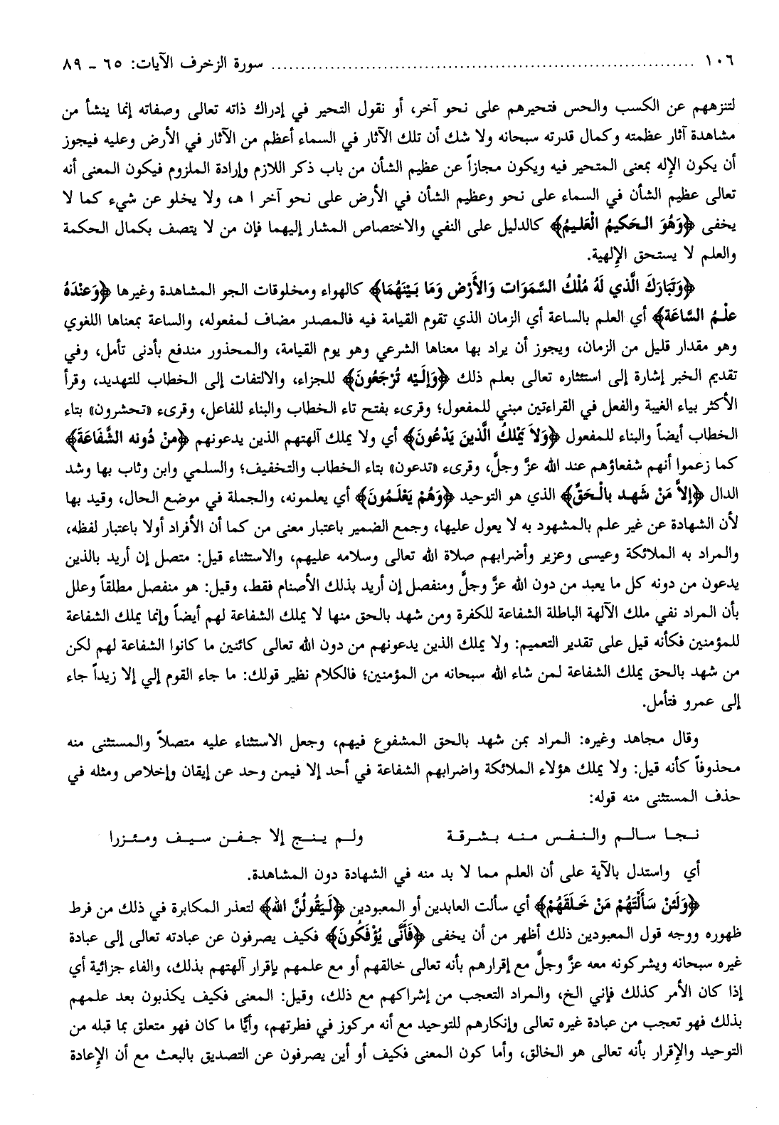 وَتَبارَكَ الَّذِي لَهُ مُلْكُ السَّماواتِ وَالْأَرْضِ وَما بَيْنَهُما كالهواء ومخلوقات الجو المشاهدة وغيرها وَعِنْدَهُ عِلْمُ السَّاعَةِ أي العلم بالساعة أي الزمان الذي تقوم القيامة فيه فالمصدر مضاف لمفعوله، والساعة بمعناها اللغوي وهو مقدار قليل من الزمان، ويجوز أن يراد بها معناها الشرعي وهو يوم القيامة، والمحذور مندفع بأدنى تأمل، وفي تقديم الخبر إشارة إلى استئثاره تعالى بعلم ذلك وَإِلَيْهِ تُرْجَعُونَ للجزاء، والالتفات إلى الخطاب للتهديد، وقرأ الأكثر بياء الغيبة والفعل في القراءتين مبني للمفعول وقرىء بفتح تاء الخطاب والبناء للفاعل، وقرىء «تحشرون» بتاء الخطاب أيضا والبناء للمفعول وَلا يَمْلِكُ الَّذِينَ يَدْعُونَ أي ولا يملك آلهتهم الذين يدعونهم مِنْ دُونِهِ الشَّفاعَةَ كما زعموا أنهم شفعاؤهم عند الله عزّ وجلّ، وقرىء «تدعون» بتاء الخطاب والتخفيف والسلمي وابن وثاب بها وشد الدال إِلَّا مَنْ شَهِدَ بِالْحَقِّ الذي هو التوحيد وَهُمْ يَعْلَمُونَ أي يعلمونه، والجملة في موضع الحال، وقيد بها لأن الشهادة عن غير علم بالمشهود به لا يعول عليها، وجمع الضمير باعتبار معنى من كما أن الأفراد أولا باعتبار لفظه، والمراد به الملائكة وعيسى وعزير وأضرابهم صلاة الله تعالى وسلامه عليهم، والاستثناء قيل: متصل إن أريد بالذين يدعون من دونه كل ما يعبد من دون الله عزّ وجلّ ومنفصل إن أريد بذلك الأصنام فقط، وقيل: هو منفصل مطلقا وعلل بأن المراد نفي ملك الآلهة الباطلة الشفاعة للكفرة ومن شهد بالحق منها لا يملك الشفاعة للمؤمنين فكأنه قيل على تقدير التعميم: ولا يملك الذين يدعونهم من دون الله تعالى كائنين ما كانوا الشفاعة لهم لكن من شهد بالحق يملك الشفاعة لمن شاء الله سبحانه من المؤمنين فالكلام نظير قولك: ما جاء القوم إلي إلا زيدا جاء إلى عمرو فتأمل.