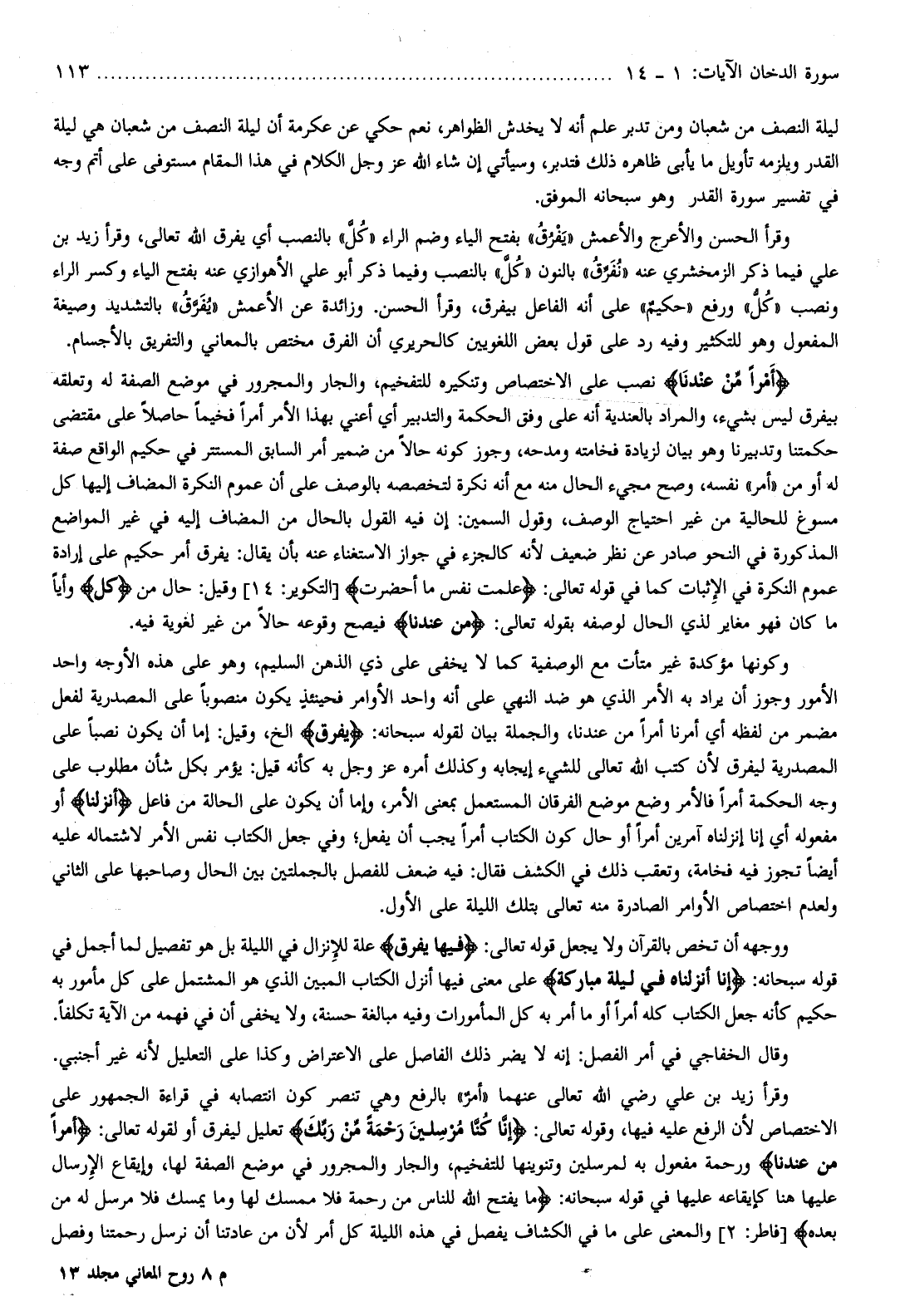 ليلة النصف من شعبان ومن تدبر علم أنه لا يخدش الظواهر، نعم حكي عن عكرمة أن ليلة النصف من شعبان هي ليلة القدر ويلزمه تأويل ما يأبى ظاهره ذلك فتدبر، وسيأتي إن شاء الله عز وجل الكلام في هذا المقام مستوفى على أتم وجه في تفسير سورة القدر وهو سبحانه الموفق.