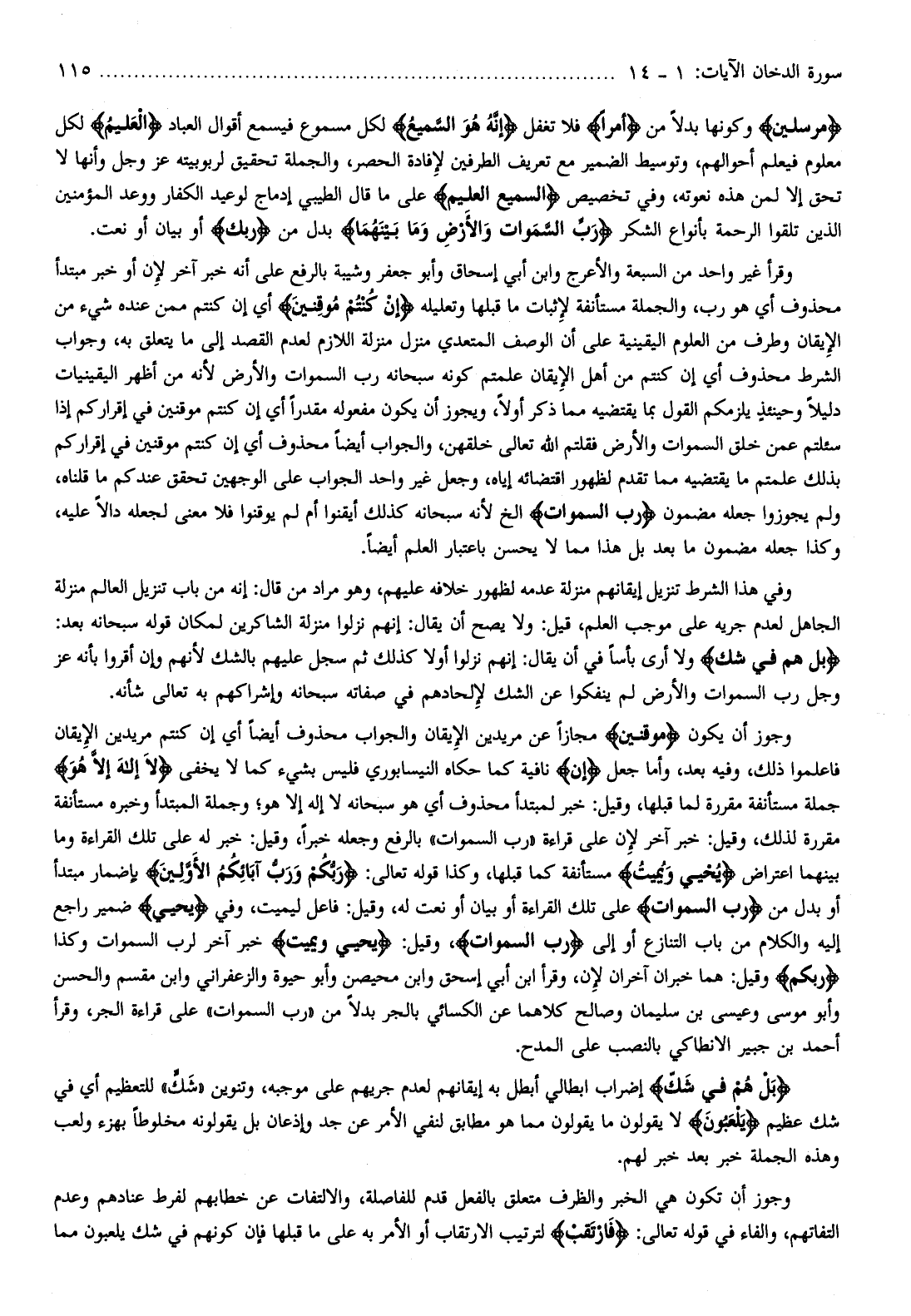 وقرأ غير واحد من السبعة والأعرج وابن أبي إسحاق وأبو جعفر وشيبة بالرفع على أنه خبر آخر لإن أو خبر مبتدأ محذوف أي هو رب، والجملة مستأنفة لإثبات ما قبلها وتعليله إِنْ كُنْتُمْ مُوقِنِينَ أي إن كنتم ممن عنده شيء من الإيقان وطرف من العلوم اليقينية على أن الوصف المتعدي منزل منزلة اللازم لعدم القصد إلى ما يتعلق به، وجواب الشرط محذوف أي إن كنتم من أهل الإيقان علمتم كونه سبحانه رب السموات والأرض لأنه من أظهر اليقينيات دليلا وحينئذ يلزمكم القول بما يقتضيه مما ذكر أولا، ويجوز أن يكون مفعوله مقدرا أي إن كنتم موقنين في إقراركم إذا سئلتم عمن خلق السموات والأرض فقلتم الله تعالى خلقهن، والجواب أيضا محذوف أي إن كنتم موقنين في إقراركم بذلك علمتم ما يقتضيه مما تقدم لظهور اقتضائه إياه، وجعل غير واحد الجواب على الوجهين تحقق عندكم ما قلناه، ولم يجوزوا جعله مضمون رَبِّ السَّماواتِ إلخ لأنه سبحانه كذلك أيقنوا أم لم يوقنوا فلا معنى لجعله دالا عليه، وكذا جعله مضمون ما بعد بل هذا مما لا يحسن باعتبار العلم أيضا.