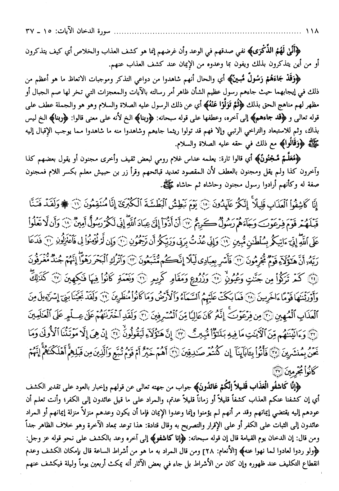 إِنَّا كاشِفُوا الْعَذابِ قَلِيلًا إِنَّكُمْ عائِدُونَ جواب من جهته تعالى عن قولهم وإخبار بالعود على تقدير الكشف أي إن كشفنا عنكم العذاب كشفا قليلا أو زمانا قليلا عدتم، والمراد على ما قيل عائدون إلى الكفر وأنت تعلم أن عودهم إليه يقتضي إيمانهم وقد مر أنهم لم يؤمنوا وإنما وعدوا الإيمان فإما أن يكون وعدهم منزلا منزلة إيمانهم أو المراد عائدون إلى الثبات على الكفر أو على الإقرار والتصريح به وقال قتادة: هذا توعد بمعاد الآخرة وهو خلاف الظاهر جدا ومن قال: إن الدخان يوم القيامة قال إن قوله سبحانه: إِنَّا كاشِفُوا إلى آخره وعد بالكشف على نحو قوله عز وجل: