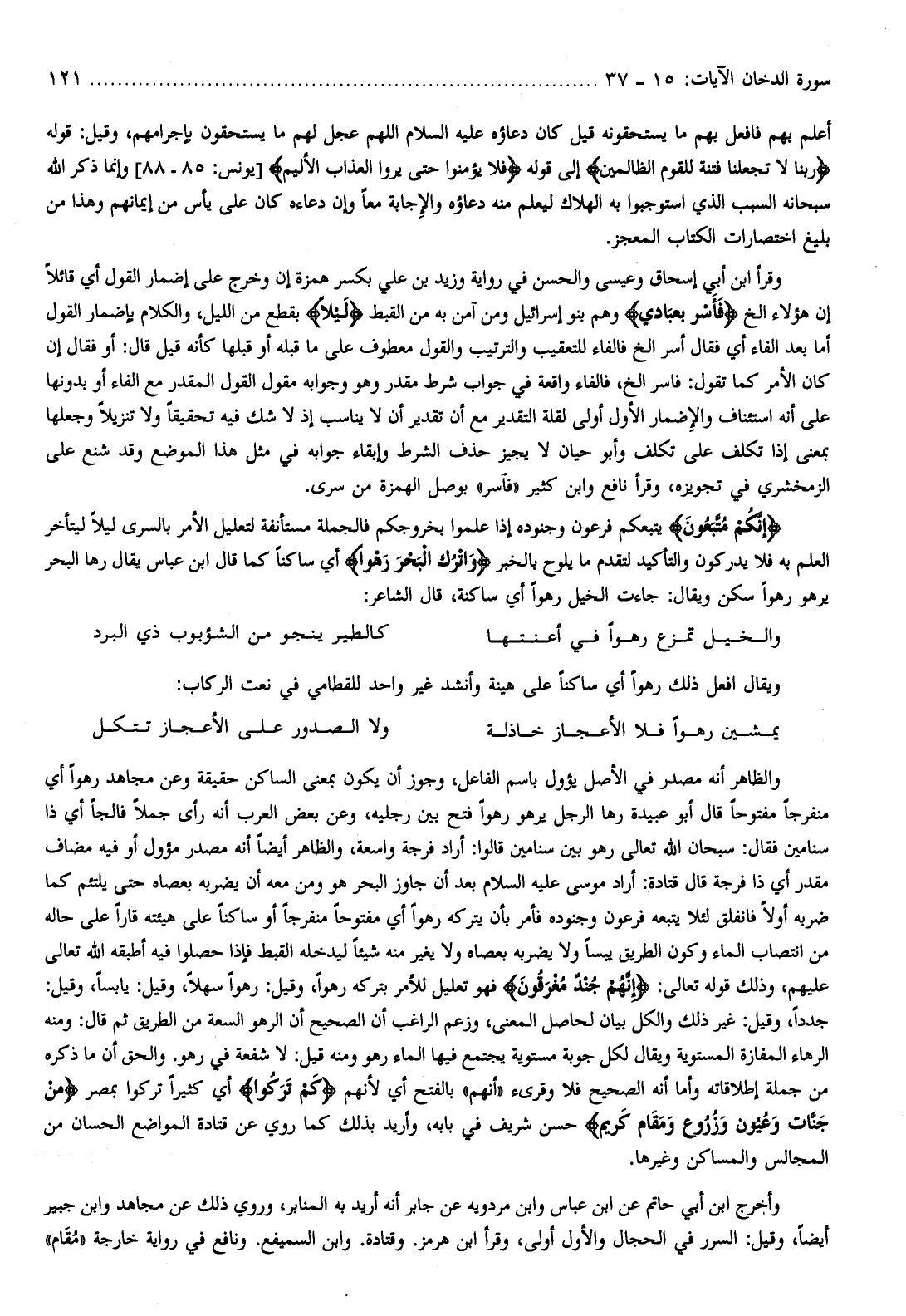 جددا، وقيل: غير ذلك والكل بيان لحاصل المعنى، وزعم الراغب أن الصحيح أن الرهو السعة من الطريق ثم قال: ومنه الرهاء المفازة المستوية ويقال لكل جوبة مستوية يجتمع فيها الماء رهو ومنه قيل: لا شفعة في رهو. والحق أن ما ذكره من جملة إطلاقاته وأما أنه الصحيح فلا وقرىء «أنهم» بالفتح أي لأنهم كَمْ تَرَكُوا أي كثيرا تركوا بمصر مِنْ جَنَّاتٍ وَعُيُونٍ وَزُرُوعٍ وَمَقامٍ كَرِيمٍ حسن شريف في بابه، وأريد بذلك كما روي عن قتادة المواضع الحسان من المجالس والمساكن وغيرها.