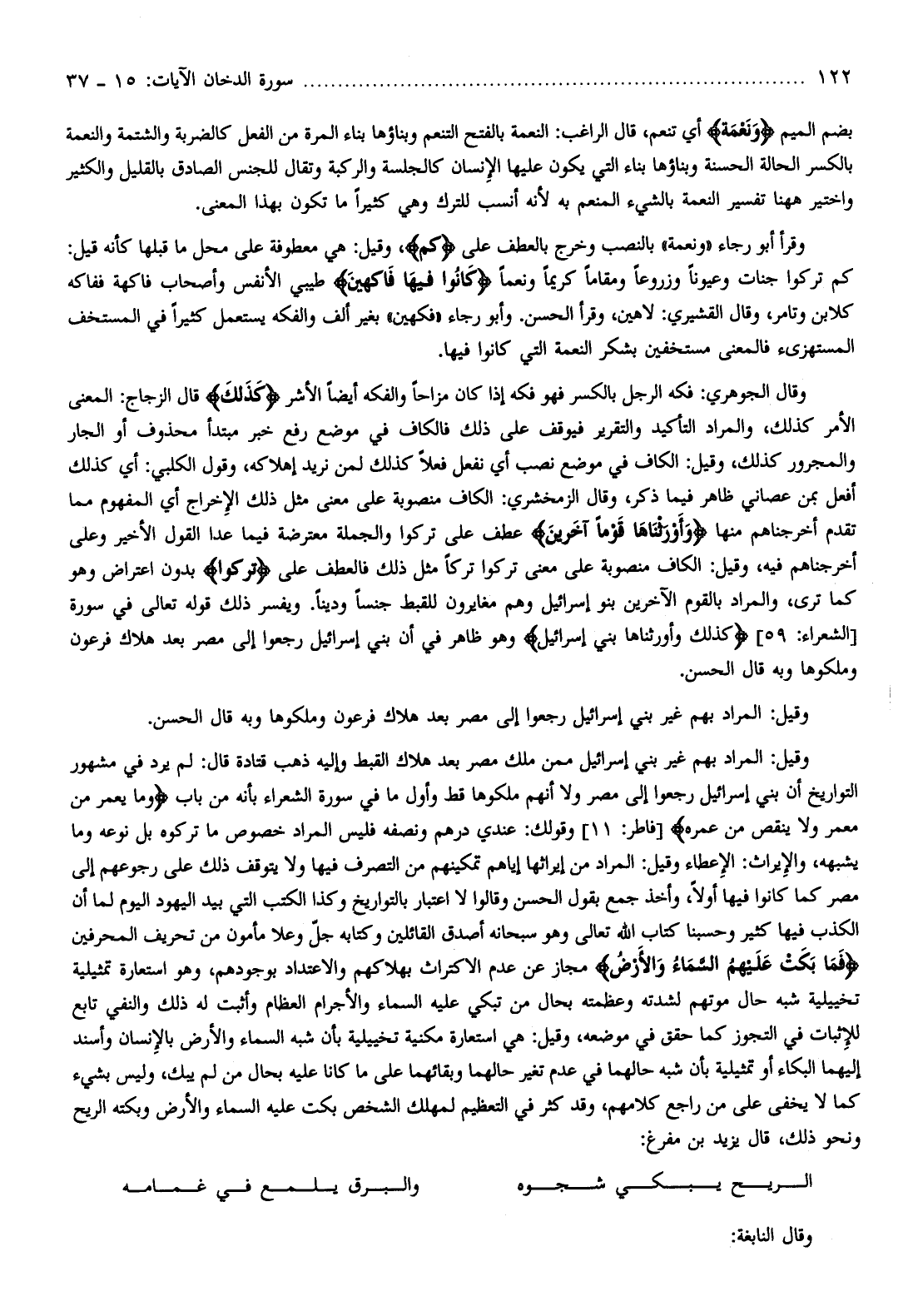 وقيل: المراد بهم غير بني إسرائيل ممن ملك مصر بعد هلاك القبط وإليه ذهب قتادة قال: لم يرد في مشهور التواريخ أن بني إسرائيل رجعوا إلى مصر ولا أنهم ملكوها قط وأول ما في سورة الشعراء بأنه من باب وَما يُعَمَّرُ مِنْ مُعَمَّرٍ وَلا يُنْقَصُ مِنْ عُمُرِهِ [فاطر: 11] وقولك: عندي درهم ونصفه فليس المراد خصوص ما تركوه بل نوعه وما يشبهه، والإيراث: الإعطاء وقيل: المراد من إيراثها إياهم تمكينهم من التصرف فيها ولا يتوقف ذلك على رجوعهم إلى مصر كما كانوا فيها أولا، وأخذ جمع بقول الحسن وقالوا لا اعتبار بالتواريخ وكذا الكتب التي بيد اليهود اليوم لما أن الكذب فيها كثير وحسبنا كتاب الله تعالى وهو سبحانه أصدق القائلين وكتابه جلّ وعلا مأمون من تحريف المحرفين فَما بَكَتْ عَلَيْهِمُ السَّماءُ وَالْأَرْضُ مجاز عن عدم الاكتراث بهلاكهم والاعتداد بوجودهم، وهو استعارة تمثيلية تخييلية شبه حال موتهم لشدته وعظمته بحال من تبكي عليه السماء والأجرام العظام وأثبت له ذلك والنفي تابع للإثبات في التجوز كما حقق في موضعه، وقيل: هي استعارة مكنية تخييلية بأن شبه السماء والأرض بالإنسان وأسند إليهما البكاء أو تمثيلية بأن شبه حالهما في عدم تغير حالهما وبقائهما على ما كانا عليه بحال من لم يبك، وليس بشيء كما لا يخفى على من راجع كلامهم، وقد كثر في التعظيم لمهلك الشخص بكت عليه السماء والأرض وبكته الريح ونحو ذلك، قال يزيد بن مفرغ: