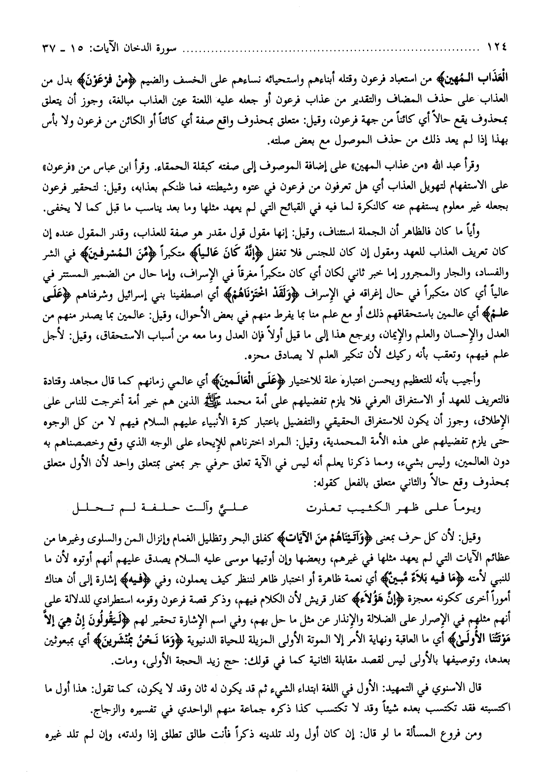 وقرأ عبد الله «من عذاب المهين» على إضافة الموصوف إلى صفته كبقلة الحمقاء. وقرأ ابن عباس من «فرعون» على الاستفهام لتهويل العذاب أي هل تعرفون من فرعون في عتوه وشيطنته فما ظنكم بعذابه، وقيل: لتحقير فرعون بجعله غير معلوم يستفهم عنه كالنكرة لما فيه في القبائح التي لم يعهد مثلها وما بعد يناسب ما قبل كما لا يخفى.