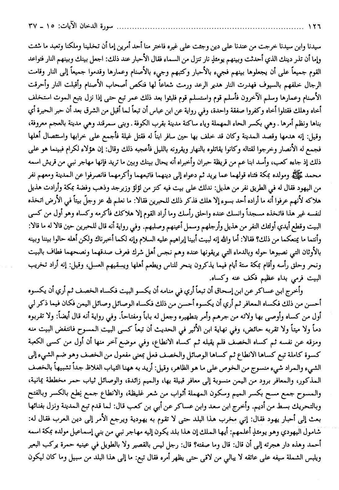 وأخرج ابن عساكر عن ابن إسحاق أن تبعا أري في منامه أن يكسو البيت فكساه الخصف ثم أري أن يكسوه أحسن من ذلك فكساه المعافر ثم أري أن يكسوه أحسن من ذلك فكساه الوصائل وصائل اليمن فكان فيما ذكر لي أول من كساه وأوصى بها ولاته من جرهم وأمر بتطهيره وجعل له بابا ومفتاحا. وفي رواية أنه قال أيضا: ولا تقربوه دما ولا ميتا ولا تقربه حائض، وفي نهاية ابن الأثير في الحديث أن تبعا كسى البيت المسوح فانتفض البيت منه ومزقه عن نفسه ثم كساه الخصف فلم يقبله ثم كساه الانطاع، وفي موضع آخر منها أن أول من كسى الكعبة كسوة كاملة تبع كساها الانطاع ثم كساها الوصائل والخصف فعل بمعنى مفعول من الخصف وهو ضم الشيء إلى الشيء والمراد شيء منسوج من الخوص على ما هو الظاهر، وقيل: أريد به هاهنا الثياب الغلاظ جدا تشبيها بالخصف المذكور، والمعافر برود من اليمن منسوبة إلى معافر قبيلة بها، والميم زائدة، والوصائل ثياب حمر مخططة يمانية، والمسوح جمع مسح بكسر الميم وسكون المهملة أثواب من شعر غليظة، والانطاع جمع نطع بالكسر وبالفتح وبالتحريك بسط من أديم. وأخرج ابن سعد وابن عساكر عن أبي بن كعب قال: لما قدم تبع المدينة ونزل بفنائها بعث إلى أحبار يهود فقال: إني مخرب هذا البلد حتى لا تقوم به يهودية ويرجع الأمر إلى دين العرب فقال له: