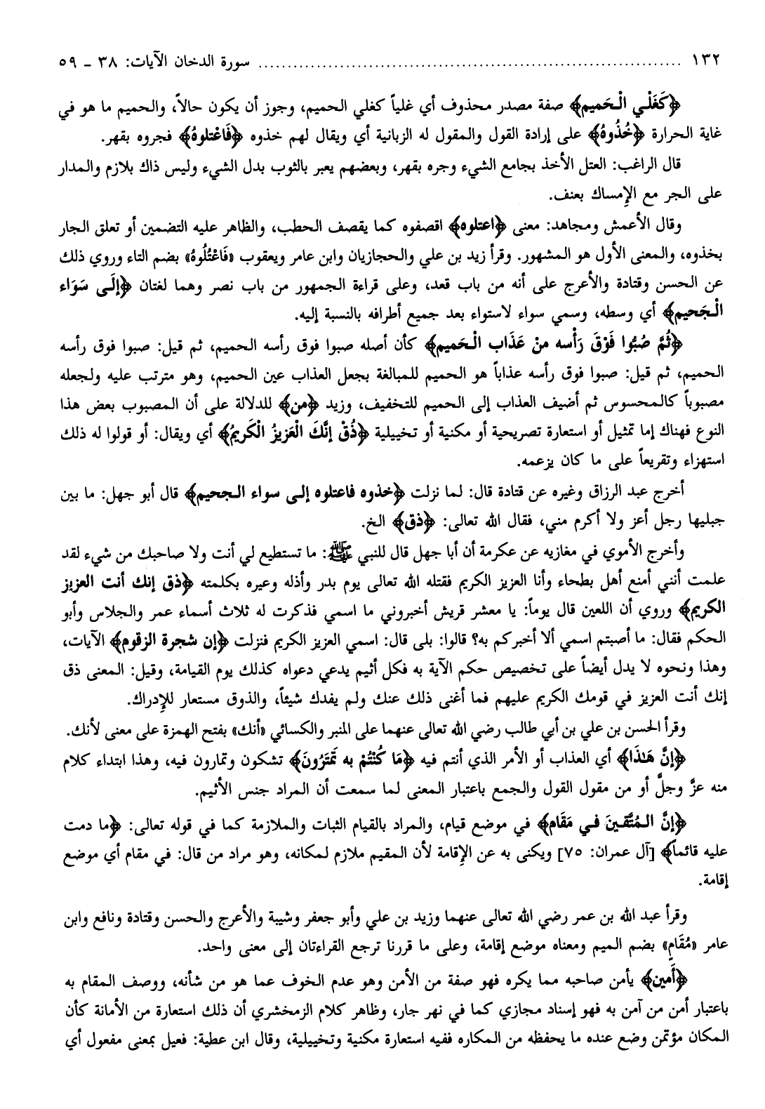 ثُمَّ صُبُّوا فَوْقَ رَأْسِهِ مِنْ عَذابِ الْحَمِيمِ كأن أصله صبوا فوق رأسه الحميم، ثم قيل: صبوا فوق رأسه الحميم، ثم قيل: صبوا فوق رأسه عذابا هو الحميم للمبالغة بجعل العذاب عين الحميم، وهو مترتب عليه ولجعله مصبوبا كالمحسوس ثم أضيف العذاب إلى الحميم للتخفيف، وزيد مِنْ للدلالة على أن المصبوب بعض هذا النوع فهناك إما تمثيل أو استعارة تصريحية أو مكنية أو تخييلية ذُقْ إِنَّكَ أَنْتَ الْعَزِيزُ الْكَرِيمُ أي ويقال: أو قولوا له ذلك استهزاء وتقريعا على ما كان يزعمه.
