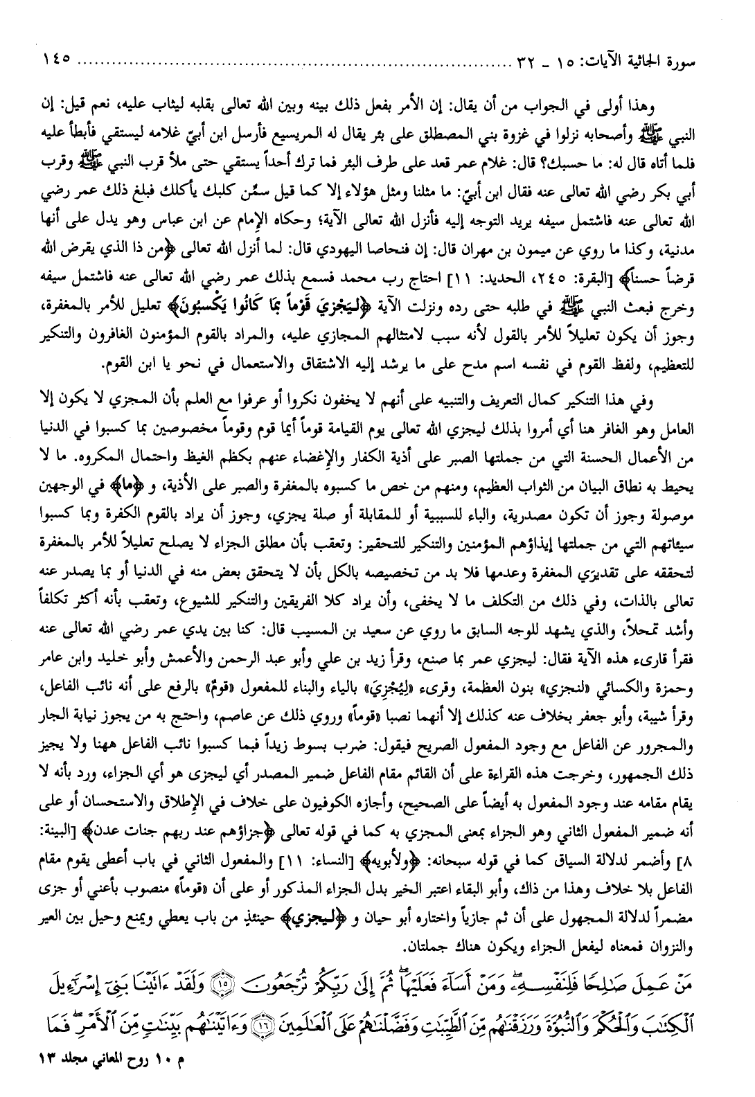 8] وأضمر لدلالة السياق كما في قوله سبحانه: وَلِأَبَوَيْهِ [النساء: 11] والمفعول الثاني في باب أعطى يقوم مقام الفاعل بلا خلاف وهذا من ذاك، وأبو البقاء اعتبر الخير بدل الجزاء المذكور أو على أن «قوما» منصوب بأعني أو جزى مضمرا لدلالة المجهول على أن ثم جازيا واختاره أبو حيان ولِيَجْزِيَ حينئذ من باب يعطي ويمنع وحيل بين العير والنزوان فمعناه ليفعل الجزاء ويكون هناك جملتان.