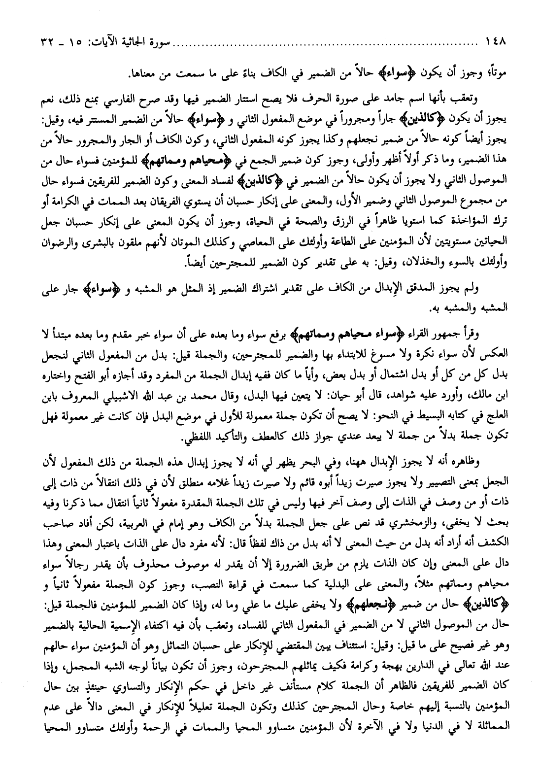 برفع سواء وما بعده على أن سواء خبر مقدم وما بعده مبتدأ لا العكس لأن سواء نكرة ولا مسوغ للابتداء بها والضمير للمجترحين، والجملة قيل: بدل من المفعول الثاني لنجعل بدل كل من كل أو بدل اشتمال أو بدل بعض، وأيا ما كان ففيه إبدال الجملة من المفرد وقد أجازه أبو الفتح واختاره ابن مالك، وأورد عليه شواهد، قال أبو حيان: لا يتعين فيها البدل، وقال محمد بن عبد الله الاشبيلي المعروف بابن العلج في كتابه البسيط في النحو: لا يصح أن تكون جملة معمولة للأول في موضع البدل فإن كانت غير معمولة فهل تكون جملة بدلا من جملة لا يبعد عندي جواز ذلك كالعطف والتأكيد اللفظي.