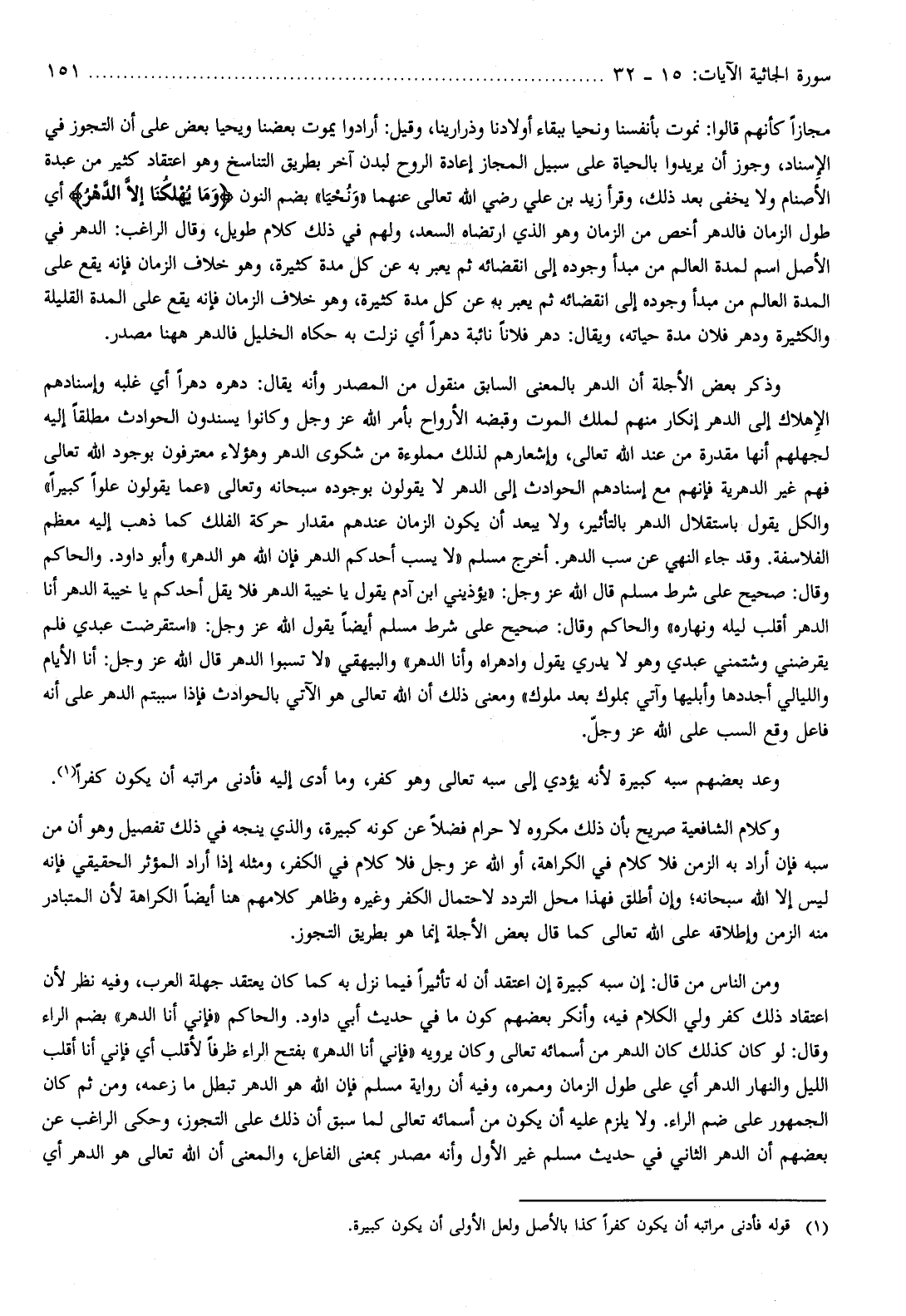 ومن الناس من قال: إن سبه كبيرة إن اعتقد أن له تأثيرا فيما نزل به كما كان يعتقد جهلة العرب، وفيه نظر لأن اعتقاد ذلك كفر ولي الكلام فيه، وأنكر بعضهم كون ما
