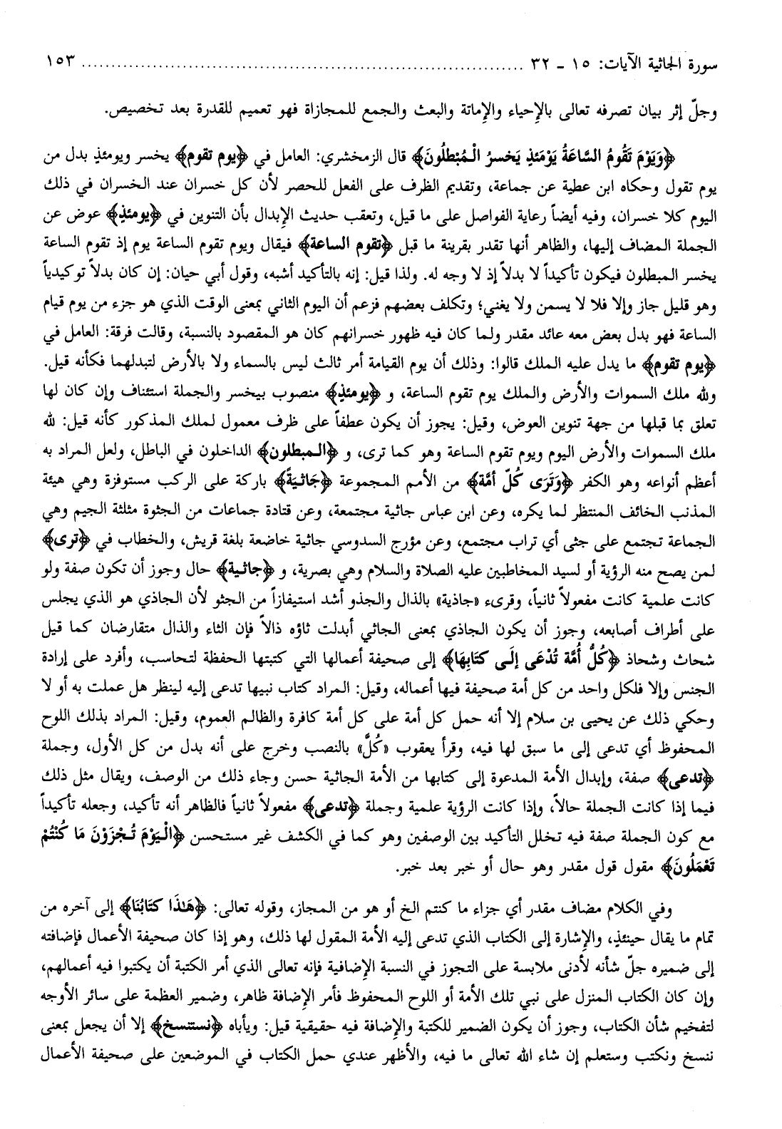 ولله ملك السموات والأرض والملك يوم تقوم الساعة، ويَوْمَئِذٍ منصوب بيخسر والجملة استئناف وإن كان لها تعلق بما قبلها من جهة تنوين العوض، وقيل: يجوز أن يكون عطفا على ظرف معمول لملك المذكور كأنه قيل: لله ملك السموات والأرض اليوم ويوم تقوم الساعة وهو كما ترى، والْمُبْطِلُونَ الداخلون في الباطل، ولعل المراد به أعظم أنواعه وهو الكفر وَتَرى كُلَّ أُمَّةٍ من الأمم المجموعة جاثِيَةً باركة على الركب مستوفزة وهي هيئة المذنب الخائف المنتظر لما يكره، وعن ابن عباس جاثية مجتمعة، وعن قتادة جماعات من الجثوة مثلثة الجيم وهي الجماعة تجتمع على جثى أي تراب مجتمع، وعن مؤرج السدوسي جاثية خاضعة بلغة قريش، والخطاب في تَرى لمن يصح منه الرؤية أو لسيد المخاطبين عليه الصلاة والسلام وهي بصرية، وجاثِيَةً حال وجوز أن تكون صفة ولو كانت علمية كانت مفعولا ثانيا، وقرىء «جاذية» بالذال والجذو أشد استيفازا من الجثو لأن الجاذي هو الذي يجلس على أطراف أصابعه، وجوز أن يكون الجاذي بمعنى الجاثي أبدلت ثاؤه ذالا فإن الثاء والذال متقارضان كما قيل شحاث وشحاذ كُلُّ أُمَّةٍ تُدْعى إِلى كِتابِهَا إلى صحيفة أعمالها التي كتبتها الحفظة لتحاسب، وأفرد على إرادة الجنس وإلا فلكل واحد من كل أمة صحيفة فيها أعماله، وقيل: المراد كتاب نبيها تدعى إليه لينظر هل عملت به أو لا وحكي ذلك عن يحيى بن سلام إلا أنه حمل كل أمة على كل أمة كافرة والظالم العموم، وقيل: المراد بذلك اللوح المحفوظ أي تدعى إلى ما سبق لها فيه، وقرأ يعقوب «كلّ» بالنصب وخرج على أنه بدل من كل الأول، وجملة تُدْعى صفة، وإبدال الأمة المدعوة إلى كتابها من الأمة الجاثية حسن وجاء ذلك من الوصف، ويقال مثل ذلك فيما إذا كانت الجملة حالا، وإذا كانت الرؤية علمية وجملة تُدْعى مفعولا ثانيا فالظاهر أنه تأكيد، وجعله تأكيدا مع كون الجملة صفة فيه تخلل التأكيد بين الوصفين وهو كما في الكشف غير مستحسن الْيَوْمَ تُجْزَوْنَ ما كُنْتُمْ تَعْمَلُونَ مقول قول مقدر وهو حال أو خبر بعد خبر.