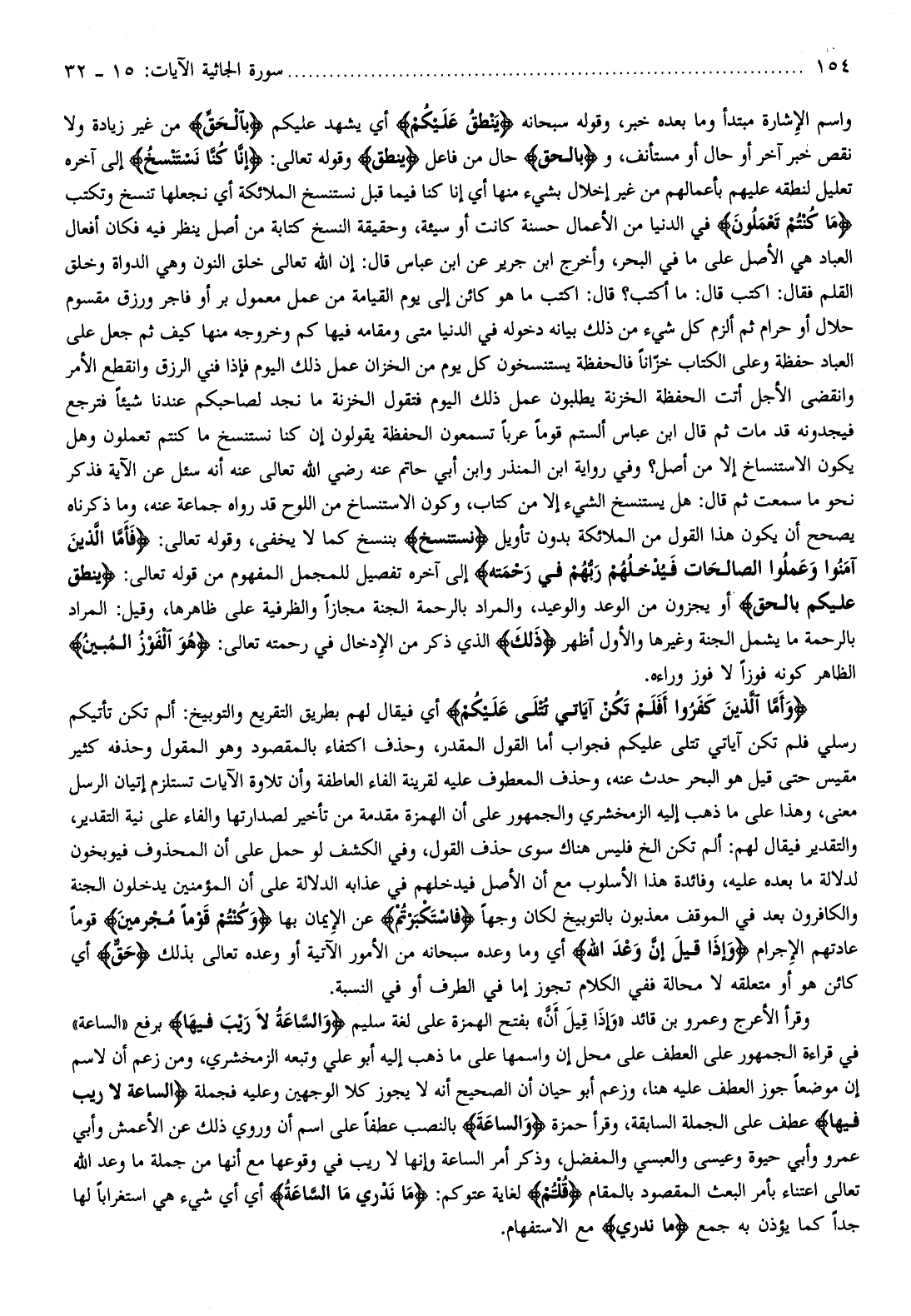 وقرأ الأعرج وعمرو بن قائد «وإذا قيل أنّ» بفتح الهمزة على لغة سليم وَالسَّاعَةُ لا رَيْبَ فِيها برفع «الساعة» في قراءة الجمهور على العطف على محل إن واسمها على ما ذهب إليه أبو علي وتبعه الزمخشري، ومن زعم أن لاسم إن موضعا جوز العطف عليه هنا، وزعم أبو حيان أن الصحيح أنه لا يجوز كلا الوجهين وعليه فجملة السَّاعَةُ لا رَيْبَ فِيها عطف على الجملة السابقة، وقرأ حمزة وَالسَّاعَةُ بالنصب عطفا على اسم أن وروي ذلك عن الأعمش وأبي عمرو وأبي حيوة وعيسى والعبسي والمفضل، وذكر أمر الساعة وإنها لا ريب في وقوعها مع أنها من جملة ما وعد الله تعالى اعتناء بأمر البعث المقصود بالمقام قُلْتُمْ لغاية عتوكم: ما نَدْرِي مَا السَّاعَةُ أي أي شيء هي استغرابا لها جدا كما يؤذن به جمع ما نَدْرِي مع الاستفهام.