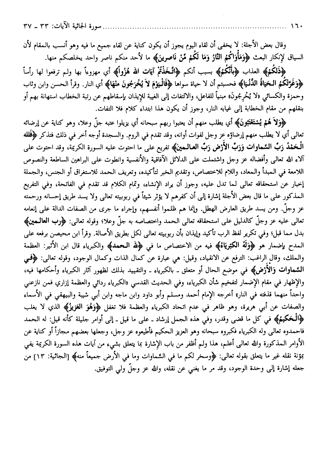 ، وهو ظاهر في عدم اتحاد الكبرياء والعظمة فلا تغفل وَهُوَ الْعَزِيزُ الذي لا يغلب الْحَكِيمُ في كل ما قضى وقدر، وفي هذه الجمل إرشاد- على ما قيل- إلى أوامر جليلة كأنه قيل: له الحمد فاحمدوه تعالى وله الكبرياء فكبروه سبحانه وهو العزيز الحكيم فأطيعوه عز وجل، وجعلها بعضهم مجازا أو كناية عن الأوامر المذكورة والله تعالى أعلم، هذا ولم أظفر من باب الإشارة بما يتعلق بشيء من آيات هذه السورة الكريمة يفي بمؤنة نقله غير ما يتعلق بقوله تعالى: وَسَخَّرَ لَكُمْ ما فِي السَّماواتِ وَما فِي الْأَرْضِ جَمِيعاً مِنْهُ [الجاثية: 13] من جعله إشارة إلى وحدة الوجود، وقد مر ما يغني عن نقله، والله عز وجلّ ولي التوفيق.