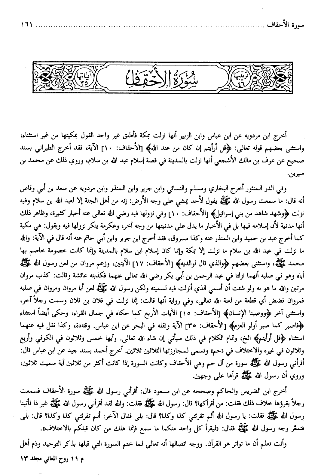 [الأحقاف: 10] وفي نزولها فيه رضي الله تعالى عنه أخبار كثيرة، وظاهر ذلك أنها مدنية لأن إسلامه فيها بل في الأخبار ما يدل على مدنيتها من وجه آخر، وعكرمة ينكر نزولها فيه ويقول: هي مكية كما أخرج عبد بن حميد وابن المنذر عنه وكذا مسروق، فقد أخرج ابن جرير وابن أبي حاتم عنه أنه قال في الآية: والله ما نزلت في عبد الله بن سلام ما نزلت إلا بمكة وإنما كان إسلام ابن سلام بالمدينة وإنما كانت خصومة خاصم بها محمد صلّى الله عليه وسلّم، واستثنى بعضهم وَالَّذِي قالَ لِوالِدَيْهِ [الأحقاف: 17] الآيتين، وزعم مروان من لعن رسول الله صلّى الله عليه وسلّم أباه وهو في صلبه أنهما نزلتا في عبد الرحمن بن أبي بكر رضي الله تعالى عنهما فكذبته عائشة وقالت: كذب مروان مرتين والله ما هو به ولو شئت أن أسمي الذي أنزلت فيه لسميته ولكن رسول الله صلّى الله عليه وسلّم لعن أبا مروان ومروان في صلبه فمروان فضض أي قطعة من لعنة الله تعالى، وفي رواية أنها قالت: إنما نزلت في فلان بن فلان وسمت رجلا آخر، واستثنى آخر وَوَصَّيْنَا الْإِنْسانَ [الأحقاف: 15] الآيات الأربع كما حكاه في جمال القراء، وحكى أيضا استثناء فَاصْبِرْ كَما صَبَرَ أُولُوا الْعَزْمِ [الأحقاف: 35] الآية ونقله في البحر عن ابن عباس. وقتادة، وكذا نقل فيه عنهما استثناء قُلْ أَرَأَيْتُمْ إلخ، وتمام الكلام في ذلك سيأتي إن شاء الله تعالى. وآيها خمس وثلاثون في الكوفي وأربع وثلاثون في غيره والاختلاف في «حم» وتسمى لمجاوزتها الثلاثين ثلاثين.