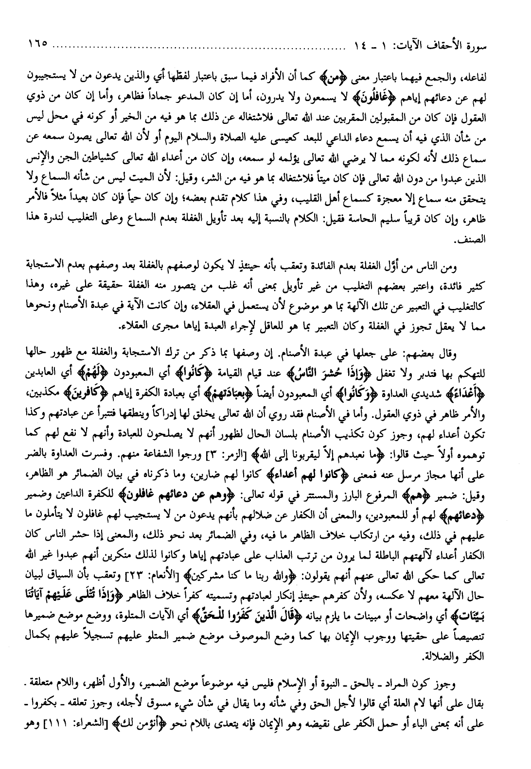 وقال بعضهم: على جعلها في عبدة الأصنام. إن وصفها بما ذكر من ترك الاستجابة والغفلة مع ظهور حالها للتهكم بها فتدبر ولا تغفل وَإِذا حُشِرَ النَّاسُ عند قيام القيامة كانُوا أي المعبودون لَهُمْ أي العابدين أَعْداءً شديدي العداوة وَكانُوا أي المعبودون أيضا بِعِبادَتِهِمْ أي بعبادة الكفرة إياهم كافِرِينَ مكذبين، والأمر ظاهر في ذوي العقول. وأما في الأصنام فقد روي أن الله تعالى يخلق لها إدراكا وينطقها فتتبرأ عن عبادتهم وكذا تكون أعداء لهم، وجوز كون تكذيب الأصنام بلسان الحال لظهور أنهم لا يصلحون للعبادة وأنهم لا نفع لهم كما توهموه أولا حيث قالوا: ما نَعْبُدُهُمْ إِلَّا لِيُقَرِّبُونا إِلَى اللَّهِ [الزمر: 3] ورجوا الشفاعة منهم. وفسرت العداوة بالضر على أنها مجاز مرسل عنه فمعنى كانُوا لَهُمْ أَعْداءً كانوا لهم ضارين، وما ذكرناه في بيان الضمائر هو الظاهر، وقيل: ضمير (هم) المرفوع البارز والمستتر في قوله تعالى: وَهُمْ عَنْ دُعائِهِمْ غافِلُونَ للكفرة الداعين وضمير دُعائِهِمْ لهم أو للمعبودين، والمعنى أن الكفار عن ضلالهم بأنهم يدعون من لا يستجيب لهم غافلون لا يتأملون ما عليهم في ذلك، وفيه من ارتكاب خلاف الظاهر ما فيه، وفي الضمائر بعد نحو ذلك، والمعنى إذا حشر الناس كان الكفار أعداء لآلهتهم الباطلة لما يرون من ترتب العذاب على عبادتهم إياها وكانوا لذلك منكرين أنهم عبدوا غير الله تعالى كما حكى الله تعالى عنهم أنهم يقولون: وَاللَّهِ رَبِّنا ما كُنَّا مُشْرِكِينَ [الأنعام: 23] وتعقب بأن السياق لبيان حال الآلهة معهم لا عكسه، ولأن كفرهم حينئذ إنكار لعبادتهم وتسميته كفرا خلاف الظاهر وَإِذا تُتْلى عَلَيْهِمْ آياتُنا بَيِّناتٍ أي واضحات أو مبينات ما يلزم بيانه قالَ الَّذِينَ كَفَرُوا لِلْحَقِّ أي الآيات المتلوة، ووضع موضع ضميرها تنصيصا على حقيتها ووجوب الإيمان بها كما وضع الموصوف موضع ضمير المتلو عليهم تسجيلا عليهم بكمال الكفر والضلالة.