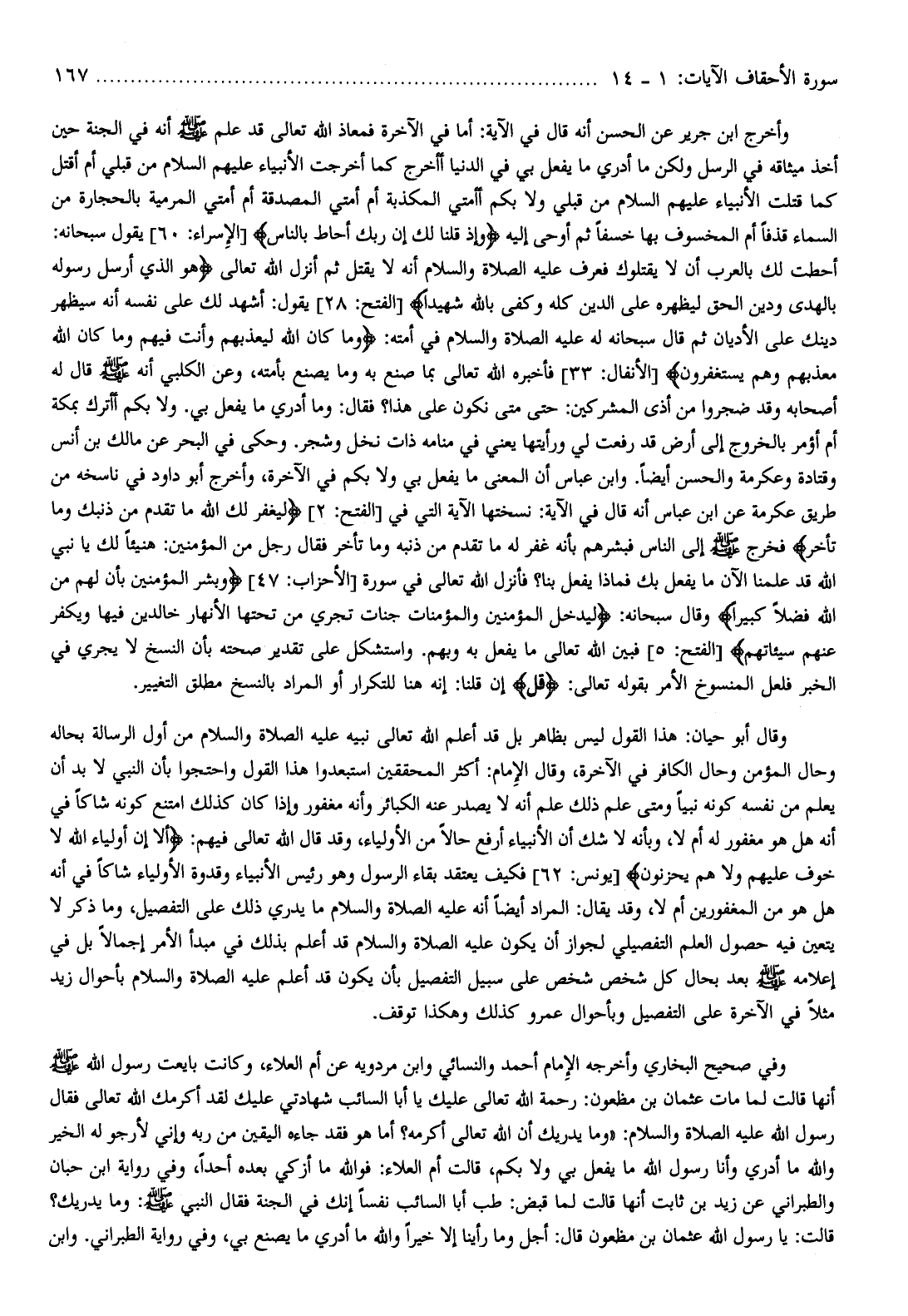 وفي صحيح البخاري وأخرجه الإمام أحمد والنسائي وابن مردويه عن أم العلاء، وكانت بايعت رسول الله صلّى الله عليه وسلّم أنها قالت لما مات عثمان بن مظعون: رحمة الله تعالى عليك يا أبا السائب شهادتي عليك لقد أكرمك الله تعالى فقال رسول الله عليه الصلاة والسلام: «وما يدريك أن الله تعالى أكرمه؟ أما هو فقد جاءه اليقين من ربه وإني لأرجو له الخير والله ما أدري وأنا رسول الله ما يفعل بي ولا بكم، قالت أم العلاء: فو الله ما أزكي بعده أحدا