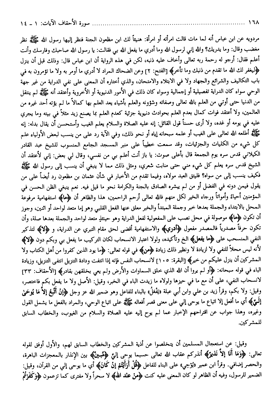 ، لكن في هذه الرواية أن ابن عباس قال: وذلك قبل أن ينزل لِيَغْفِرَ لَكَ اللَّهُ ما تَقَدَّمَ مِنْ ذَنْبِكَ وَما تَأَخَّرَ [الفتح: 2] وعن الضحاك المراد لا أدري ما أومر به ولا ما تؤمرون به في باب التكاليف والشرائع والجهاد ولا في الابتلاء والامتحان، والذي أختاره أن المعنى على نفي الدراية من غير جهة الوحي سواء كان الدراية تفصيلية أو إجمالية وسواء كان ذلك في الأمور الدنيوية أو الأخروية وأعتقد أنه صلّى الله عليه وسلّم لم ينتقل من الدنيا حتى أوتي من العلم بالله تعالى وصفاته وشؤونه والعلم بأشياء يعد العلم بها كمالا ما لم يؤته أحد غيره من العالمين، ولا أعتقد فوات كمال بعدم العلم بحوادث دنيوية جزئية كعدم العلم بما يصنع زيد مثلا في بيته وما يجري عليه في يومه أو غده، ولا أرى حسنا قول القائل: إنه عليه الصلاة والسلام يعلم الغيب وأستحسن أن يقال بدله: إنه صلّى الله عليه وسلّم أطلعه الله تعالى على الغيب أو علمه سبحانه إياه أو نحو ذلك، وفي الآية رد على من ينسب لبعض الأولياء علم كل شيء من الكليات والجزئيات، وقد سمعت خطيبا على منبر المسجد الجامع المنسوب للشيخ عبد القادر الكيلاني قدس سره يوم الجمعة قال بأعلى صوت: يا باز أنت أعلم بي من نفسي، وقال لي بعض: إني لأعتقد أن الشيخ قدس سره يعلم كل شيء مني حتى منابت شعري، ومثل ذلك مما لا ينبغي أن ينسب إلى رسول الله صلّى الله عليه وسلّم فكيف ينسب إلى من سواه؟ فليتق العبد مولاه، وفيما تقدم من الأخبار في شأن عثمان بن مظعون رد أيضا على من يقول فيمن دونه في الفضل أو من لم يبشره الصادق بالجنة والكرامة نحو ما قيل فيه. نعم ينبغي الظن الحسن في المؤمنين أحياء وأمواتا ورجاء الخير لكل منهم فالله تعالى أرحم الراحمين، هذا والظاهر أن ما استفهامية مرفوعة المحل بالابتداء والجملة بعدها خبر وجملة المبتدأ والخبر معلق عنها الفعل القلبي وهو إما متعد لواحد أو اثنين، وجوز أن تكون ما موصولة في محل نصب على المفعولية لفعل الدراية وهو حينئذ متعد لواحد والجملة بعدها صلة، وأن تكون حرفا مصدريا فالمصدر مفعول أَدْرِي والاستفهامية أقضى لحق مقام التبري عن الدراية، ولا لتذكير النفي المنسحب على ما يُفْعَلُ إلخ وتأكيده، ولولا اعتبار الانسحاب لكان التركيب ما يفعل بي وبكم دون لا لأنه ليس محلا للنفي ولا لزيادة لا ونظير ذلك زيادة مِنَ في قوله تعالى: ما يَوَدُّ الَّذِينَ كَفَرُوا مِنْ أَهْلِ الْكِتابِ وَلَا الْمُشْرِكِينَ أَنْ يُنَزَّلَ عَلَيْكُمْ مِنْ خَيْرٍ [البقرة: 105] لانسحاب النفس فإنه إذا انتفت ودادة التنزيل انتفى التنزيل، وزيادة الباء في قوله سبحانه: أَوَلَمْ يَرَوْا أَنَّ اللَّهَ الَّذِي خَلَقَ السَّماواتِ وَالْأَرْضَ وَلَمْ يَعْيَ بِخَلْقِهِنَّ بِقادِرٍ [الأحقاف: 33] لانسحاب النفي، على أن مع ما في حيزها ولولاه ما زيدت الباء في الخبر، وقيل: الأصل ولا ما يفعل بكم فاختصر، وقيل: ولا بكم، وقرأ زيد بن علي وابن أبي عبلة «يفعل» بالبناء للفاعل وهو ضمير الله عز وجل إِنْ أَتَّبِعُ إِلَّا ما يُوحى إِلَيَّ أي ما أفعل إلا اتباع ما يوحى إلي على معنى قصر أفعاله صلّى الله عليه وسلّم على اتباع الوحي، والمراد بالفعل ما يشمل القول وغيره، وهذا جواب عن اقتراحهم الإخبار عما لم يوح إليه عليه الصلاة والسلام من الغيوب، والخطاب السابق للمشركين.