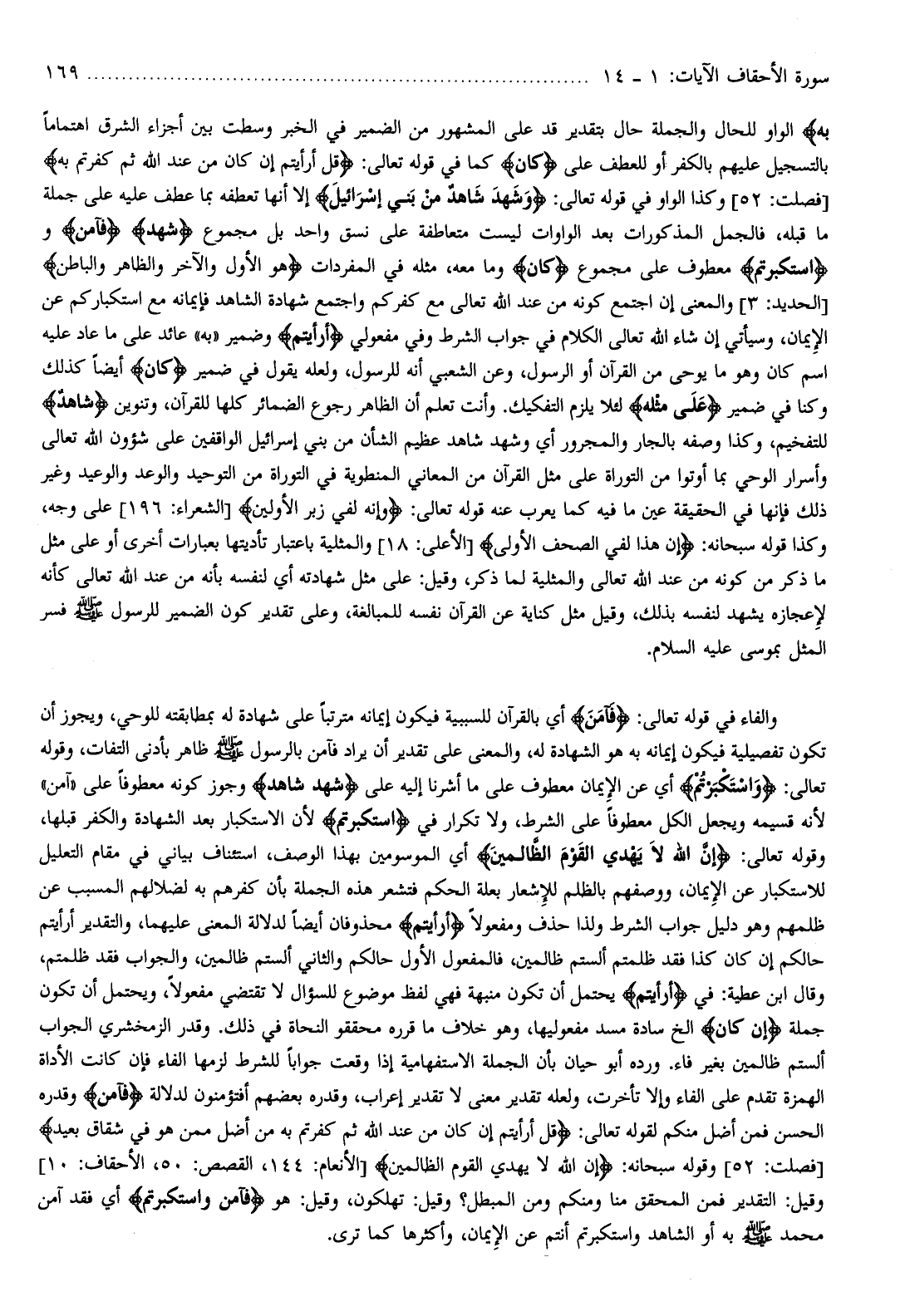 والفاء في قوله تعالى: فَآمَنَ أي بالقرآن للسببية فيكون إيمانه مترتبا على شهادة له بمطابقته للوحي، ويجوز أن تكون تفصيلية فيكون إيمانه به هو الشهادة له، والمعنى على تقدير أن يراد فآمن بالرسول صلّى الله عليه وسلّم ظاهر بأدنى التفات، وقوله تعالى: وَاسْتَكْبَرْتُمْ أي عن الإيمان معطوف على ما أشرنا إليه على شَهِدَ شاهِدٌ وجوز كونه معطوفا على «آمن» لأنه قسيمه ويجعل الكل معطوفا على الشرط، ولا تكرار في اسْتَكْبَرْتُمْ لأن الاستكبار بعد الشهادة والكفر قبلها، وقوله تعالى: إِنَّ اللَّهَ لا يَهْدِي الْقَوْمَ الظَّالِمِينَ أي الموسومين بهذا الوصف، استئناف بياني في مقام التعليل للاستكبار عن الإيمان، ووصفهم بالظلم للإشعار بعلة الحكم فتشعر هذه الجملة بأن كفرهم به لضلالهم المسبب عن ظلمهم وهو دليل جواب الشرط ولذا حذف ومفعولا أَرَأَيْتُمْ محذوفان أيضا لدلالة المعنى عليهما، والتقدير أرأيتم حالكم إن كان كذا فقد ظلمتم ألستم ظالمين، فالمفعول الأول حالكم والثاني ألستم ظالمين، والجواب فقد ظلمتم، وقال ابن عطية: في أَرَأَيْتُمْ يحتمل أن تكون منبهة فهي لفظ موضوع للسؤال لا تقتضي مفعولا، ويحتمل أن تكون جملة إِنْ كانَ إلخ سادة مسد مفعوليها، وهو خلاف ما قرره محققو النحاة في ذلك. وقدر الزمخشري الجواب ألستم ظالمين بغير فاء. ورده أبو حيان بأن الجملة الاستفهامية إذا وقعت جوابا للشرط لزمها الفاء فإن كانت الأداة الهمزة تقدم على الفاء وإلا تأخرت، ولعله تقدير معنى لا تقدير إعراب، وقدره بعضهم أفتؤمنون لدلالة فَآمَنَ وقدره الحسن فمن أضل منكم لقوله تعالى: قُلْ أَرَأَيْتُمْ إِنْ كانَ مِنْ عِنْدِ اللَّهِ ثُمَّ كَفَرْتُمْ بِهِ مَنْ أَضَلُّ مِمَّنْ هُوَ فِي شِقاقٍ بَعِيدٍ [فصلت: 52] وقوله سبحانه: إِنَّ اللَّهَ لا يَهْدِي الْقَوْمَ الظَّالِمِينَ [الأنعام: 144، القصص: 50، الأحقاف: 10] وقيل: التقدير فمن المحقق منا ومنكم ومن المبطل؟ وقيل: تهلكون، وقيل: هو فَآمَنَ وَاسْتَكْبَرْتُمْ أي فقد آمن محمد صلّى الله عليه وسلّم به أو الشاهد واستكبرتم أنتم عن الإيمان، وأكثرها كما ترى.