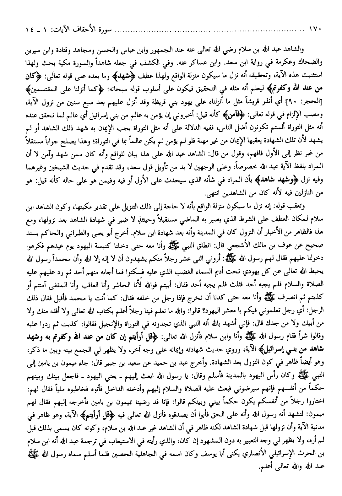 ، وهو ظاهر في مدنية الآية وأن نزولها قبل شهادة الشاهد لكنه ظاهر في أن الشاهد غير عبد الله بن سلام، وكونه كان يسمى بذلك قبل لم أره، ولا يظهر لي وجه التعبير به دون المشهود إن كان، والذي رأيته في الاستيعاب في ترجمة عبد الله أنه ابن سلام بن الحرث الإسرائيلي الأنصاري يكنى أبا يوسف وكان اسمه في الجاهلية الحصين فلما أسلم سماه رسول الله صلّى الله عليه وسلّم عبد الله والله تعالى أعلم.