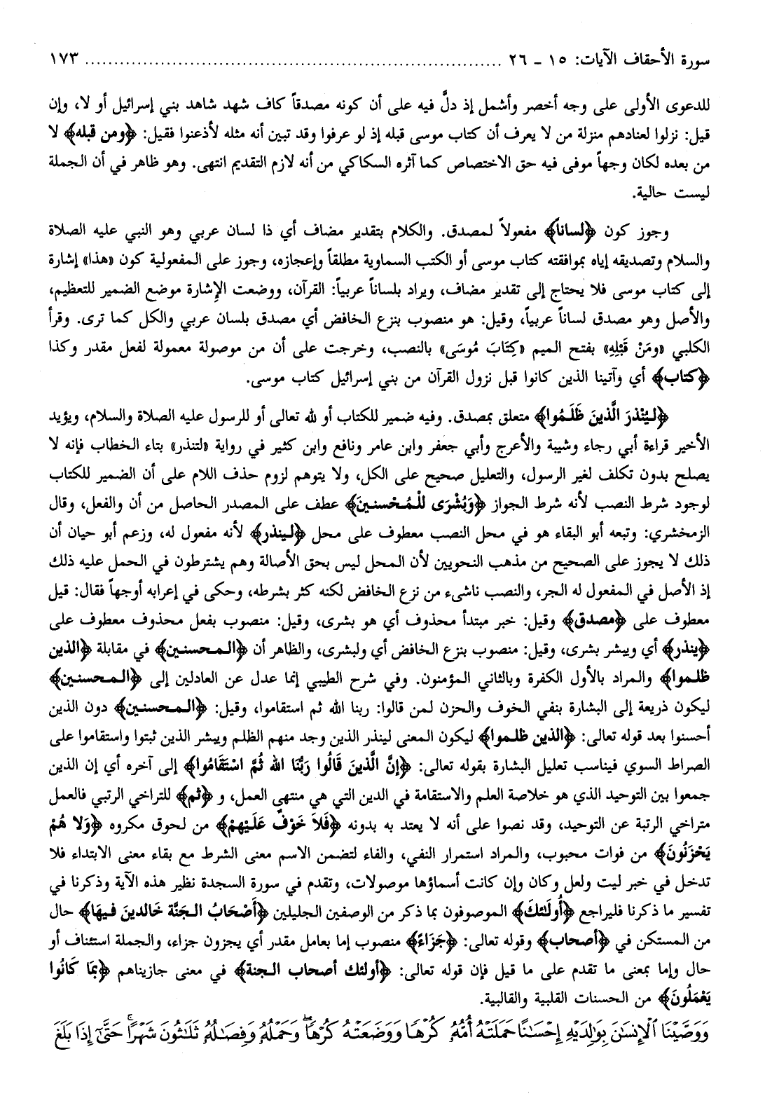 لِيُنْذِرَ الَّذِينَ ظَلَمُوا متعلق بمصدق. وفيه ضمير للكتاب أو لله تعالى أو للرسول عليه الصلاة والسلام، ويؤيد الأخير قراءة أبي رجاء وشيبة والأعرج وأبي جعفر وابن عامر ونافع وابن كثير في رواية «لتنذر» بتاء الخطاب فإنه لا يصلح بدون تكلف لغير الرسول، والتعليل صحيح على الكل، ولا يتوهم لزوم حذف اللام على أن الضمير للكتاب لوجود شرط النصب لأنه شرط الجواز وَبُشْرى لِلْمُحْسِنِينَ عطف على المصدر الحاصل من أن والفعل، وقال الزمخشري: وتبعه أبو البقاء هو في محل النصب معطوف على محل لِيُنْذِرَ لأنه مفعول له، وزعم أبو حيان أن ذلك لا يجوز على الصحيح من مذهب النحويين لأن المحل ليس بحق الأصالة وهم يشترطون في الحمل عليه ذلك إذ الأصل في المفعول له الجر، والنصب ناشىء من نزع الخافض لكنه كثر بشرطه، وحكى في إعرابه أوجها فقال: قيل معطوف على مُصَدِّقٌ وقيل: خبر مبتدأ محذوف أي هو بشرى، وقيل: منصوب بفعل محذوف معطوف على (ينذر) أي ويبشر بشرى، وقيل: منصوب بنزع الخافض أي ولبشرى، والظاهر أن (المحسنين) في مقابلة الَّذِينَ ظَلَمُوا والمراد بالأول الكفرة وبالثاني المؤمنون. وفي شرح الطيبي إنما عدل عن العادلين إلى (المحسنين) ليكون ذريعة إلى البشارة بنفي الخوف والحزن لمن قالوا: ربنا الله ثم استقاموا، وقيل: (المحسنين) دون الذين أحسنوا بعد قوله تعالى: الَّذِينَ ظَلَمُوا ليكون المعنى لينذر الذين وجد منهم الظلم ويبشر الذين ثبتوا واستقاموا على الصراط السوي فيناسب تعليل البشارة بقوله تعالى: إِنَّ الَّذِينَ قالُوا رَبُّنَا اللَّهُ ثُمَّ اسْتَقامُوا إلى آخره أي إن الذين جمعوا بين التوحيد الذي هو خلاصة العلم والاستقامة في الدين التي هي منتهى العمل، وثُمَّ للتراخي الرتبي فالعمل متراخي الرتبة عن التوحيد، وقد نصوا على أنه لا يعتد به بدونه فَلا خَوْفٌ عَلَيْهِمْ من لحوق مكروه وَلا هُمْ يَحْزَنُونَ من فوات محبوب، والمراد استمرار النفي، والفاء لتضمن الاسم معنى الشرط مع بقاء معنى الابتداء فلا تدخل في خبر ليت ولعل وكان وإن كانت أسماؤها موصولات، وتقدم في سورة السجدة نظير هذه الآية وذكرنا في تفسير ما ذكرنا فليراجع أُولئِكَ الموصوفون بما ذكر من الوصفين الجليلين أَصْحابُ الْجَنَّةِ خالِدِينَ فِيها حال من المستكن في أَصْحابُ وقوله تعالى: جَزاءً منصوب إما بعامل مقدر أي يجزون جزاء، والجملة استئناف أو حال وإما بمعنى ما تقدم على ما قيل فإن قوله تعالى: أُولئِكَ أَصْحابُ الْجَنَّةِ في معنى جازيناهم بِما كانُوا يَعْمَلُونَ من الحسنات القلبية والقالبية.