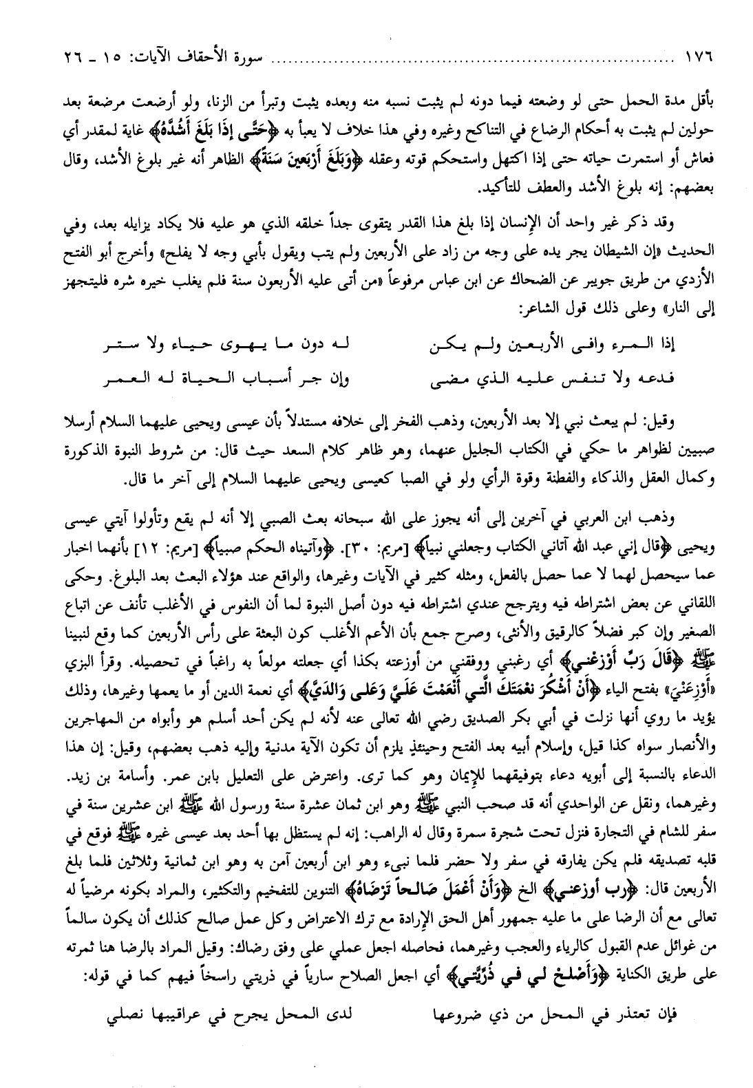 وذهب ابن العربي في آخرين إلى أنه يجوز على الله سبحانه بعث الصبي إلا أنه لم يقع وتأولوا آيتي عيسى ويحيى قالَ إِنِّي عَبْدُ اللَّهِ آتانِيَ الْكِتابَ وَجَعَلَنِي نَبِيًّا [مريم: 30] . وَآتَيْناهُ الْحُكْمَ صَبِيًّا [مريم: 12] بأنهما اخبار عما سيحصل لهما لا عما حصل بالفعل، ومثله كثير في الآيات وغيرها، والواقع عند هؤلاء البعث بعد البلوغ. وحكى اللقاني عن بعض اشتراطه فيه ويترجح عندي اشتراطه فيه دون أصل النبوة لما أن النفوس في الأغلب تأنف عن اتباع الصغير وإن كبر فضلا كالرقيق والأنثى، وصرح جمع بأن الأعم الأغلب كون البعثة على رأس الأربعين كما وقع لنبينا صلّى الله عليه وسلّم قالَ رَبِّ أَوْزِعْنِي أي رغبني ووفقني من أوزعته بكذا أي جعلته مولعا به راغبا في تحصيله. وقرأ البزي «أوزعني» بفتح الياء أَنْ أَشْكُرَ نِعْمَتَكَ الَّتِي أَنْعَمْتَ عَلَيَّ وَعَلى والِدَيَّ أي نعمة الدين أو ما يعمها وغيرها، وذلك يؤيد ما روي أنها نزلت في أبي بكر الصديق رضي الله تعالى عنه لأنه لم يكن أحد أسلم هو وأبواه من المهاجرين والأنصار سواه كذا قيل، وإسلام أبيه بعد الفتح وحينئذ يلزم أن تكون الآية مدنية وإليه ذهب بعضهم، وقيل: إن هذا الدعاء بالنسبة إلى أبويه دعاء بتوفيقهما للإيمان وهو كما ترى. واعترض على التعليل بابن عمر. وأسامة بن زيد.