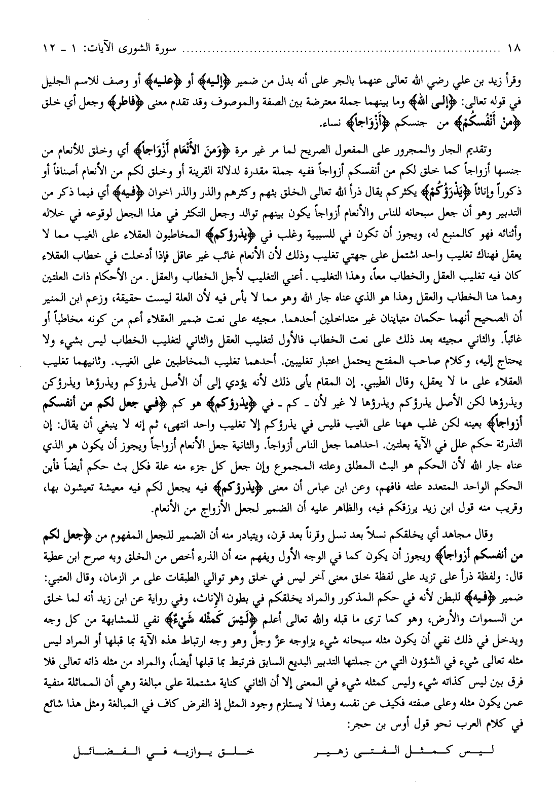 وقال مجاهد أي يخلقكم نسلا بعد نسل وقرنا بعد قرن، ويتبادر منه أن الضمير للجعل المفهوم من جَعَلَ لَكُمْ مِنْ أَنْفُسِكُمْ أَزْواجاً ويجوز أن يكون كما في الوجه الأول ويفهم منه أن الذرء أخص من الخلق وبه صرح ابن عطية قال: ولفظة ذرأ على تزيد على لفظة خلق معنى آخر ليس في خلق وهو توالي الطبقات على مر الزمان، وقال العتبي: