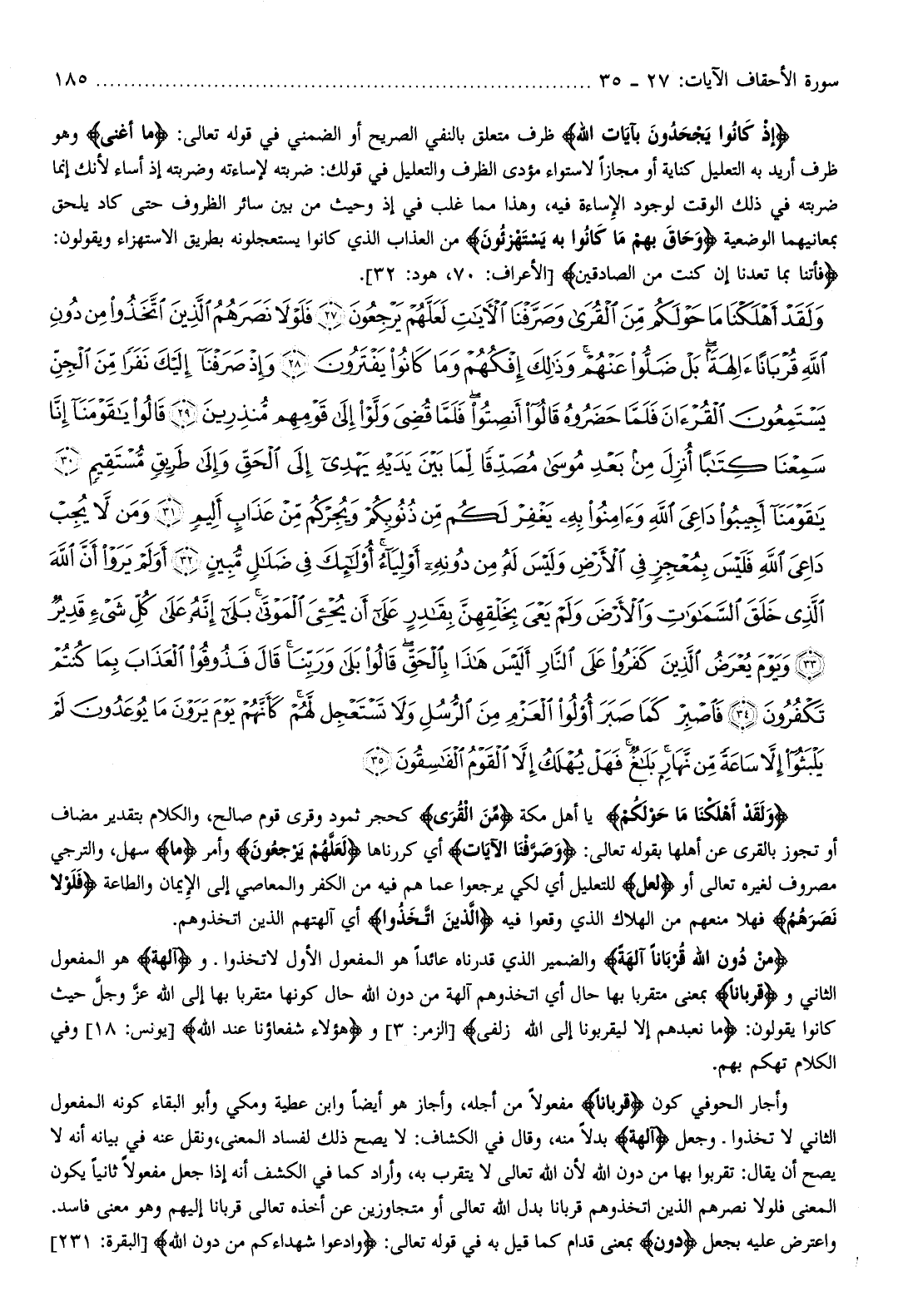 وَلَقَدْ أَهْلَكْنا ما حَوْلَكُمْ يا أهل مكة مِنَ الْقُرى كحجر ثمود وقرى قوم صالح، والكلام بتقدير مضاف أو تجوز بالقرى عن أهلها بقوله تعالى: وَصَرَّفْنَا الْآياتِ أي كررناها لَعَلَّهُمْ يَرْجِعُونَ وأمر ما سهل، والترجي مصروف لغيره تعالى أو (لعل) للتعليل أي لكي يرجعوا عما هم فيه من الكفر والمعاصي إلى الإيمان والطاعة فَلَوْلا نَصَرَهُمُ فهلا منعهم من الهلاك الذي وقعوا فيه الَّذِينَ اتَّخَذُوا أي آلهتهم الذين اتخذوهم.