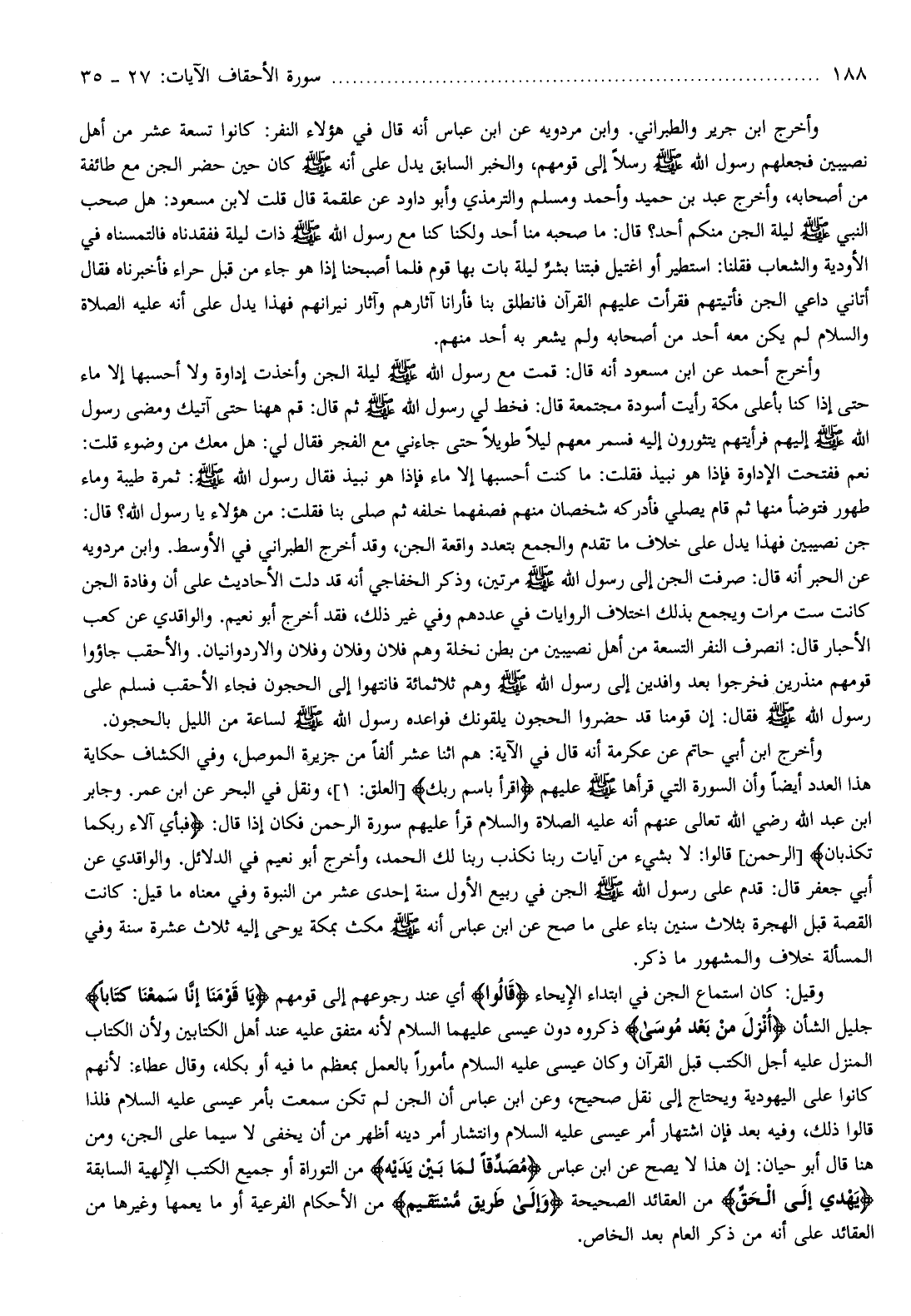 وأخرج ابن جرير والطبراني. وابن مردويه عن ابن عباس أنه قال في هؤلاء النفر: كانوا تسعة عشر من أهل نصيبين فجعلهم رسول الله صلّى الله عليه وسلّم رسلا إلى قومهم، والخبر السابق يدل على أنه صلّى الله عليه وسلّم كان حين حضر الجن مع طائفة من أصحابه، وأخرج عبد بن حميد وأحمد ومسلم والترمذي وأبو داود عن علقمة قال قلت لابن مسعود: هل صحب النبي صلّى الله عليه وسلّم ليلة الجن منكم أحد؟ قال: ما صحبه منا أحد ولكنا كنا مع رسول الله صلّى الله عليه وسلّم ذات ليلة ففقدناه فالتمسناه في الأودية والشعاب فقلنا: استطير أو اغتيل فبتنا بشرّ ليلة بات بها قوم فلما أصبحنا إذا هو جاء من قبل حراء فأخبرناه فقال أتاني داعي الجن فأتيتهم فقرأت عليهم القرآن فانطلق بنا فأرانا آثارهم وآثار نيرانهم فهذا يدل على أنه عليه الصلاة والسلام لم يكن معه أحد من أصحابه ولم يشعر به أحد منهم.