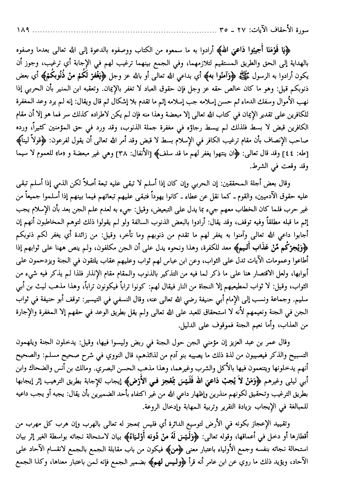 وقال عمر بن عبد العزيز إن مؤمني الجن حول الجنة في ربض وليسوا فيها، وقيل: يدخلون الجنة ويلهمون التسبيح والذكر فيصيبون من لذة ذلك ما يصيبه بنو آدم من لذائذهم، قال النووي في شرح صحيح مسلم: والصحيح أنهم يدخلونها ويتنعمون فيها بالأكل والشرب وغيرهما، وهذا مذهب الحسن البصري. ومالك بن أنس والضحاك وابن أبي ليلى وغيرهم وَمَنْ لا يُجِبْ داعِيَ اللَّهِ فَلَيْسَ بِمُعْجِزٍ فِي الْأَرْضِ إيجاب للإجابة بطريق الترهيب إثر إيجابها بطريق الترغيب وتحقيق لكونهم منذرين وإظهار داعي الله من غير اكتفاء بأحد الضميرين بأن يقال: يجبه أو يجب داعيه للمبالغة في الإيجاب بزيادة التقرير وتربية المهابة وإدخال الروعة.