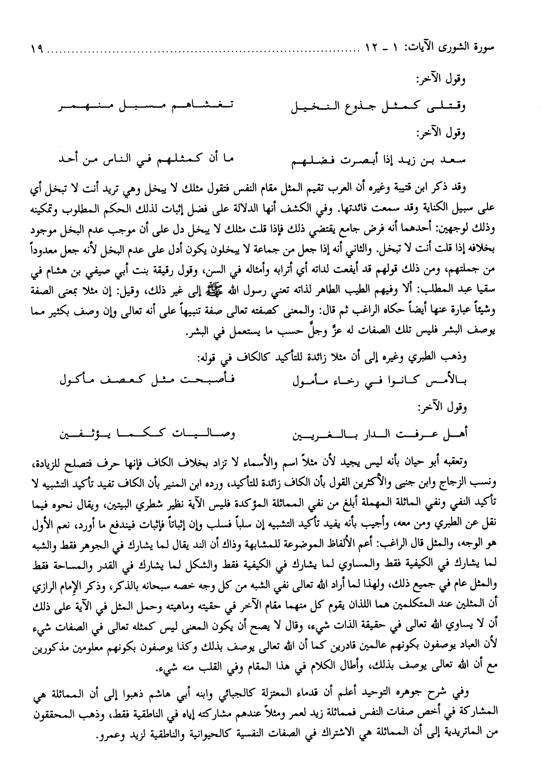 وتعقبه أبو حيان بأنه ليس يجيد لأن مثلا اسم والأسماء لا تزاد بخلاف الكاف فإنها حرف فتصلح للزيادة، ونسب الزجاج وابن جني والأكثرين القول بأن الكاف زائدة للتأكيد، ورده ابن المنير بأن الكاف تفيد تأكيد التشبيه لا تأكيد النفي ونفي الماثلة المهملة أبلغ من نفي المماثلة المؤكدة فليس الآية نظير شطري البيتين، ويقال نحوه فيما نقل عن الطبري ومن معه، وأجيب بأنه يفيد تأكيد التشبيه إن سلبا فسلب وإن إثباتا فإثبات فيندفع ما أورد، نعم الأول هو الوجه، والمثل قال الراغب: أعم الألفاظ الموضوعة للمشابهة وذاك أن الند يقال لما يشارك في الجوهر فقط والشبه لما يشارك في الكيفية فقط والمساوي لما يشارك في الكيفية فقط والشكل لما يشارك في القدر والمساحة فقط والمثل عام في جميع ذلك، ولهذا لما أراد الله تعالى نفي الشبه من كل وجه خصه سبحانه بالذكر، وذكر الإمام الرازي أن المثلين عند المتكلمين هما اللذان يقوم كل منهما مقام الآخر في حقيته وماهيته وحمل المثل في الآية على ذلك أن لا يساوي الله تعالى في حقيقة الذات شيء، وقال لا يصح أن يكون المعنى ليس كمثله تعالى في الصفات شيء لأن العباد يوصفون بكونهم عالمين قادرين كما أن الله تعالى يوصف بذلك وكذا يوصفون بكونهم معلومين مذكورين مع أن الله تعالى يوصف بذلك، وأطال الكلام في هذا المقام وفي القلب منه شيء.