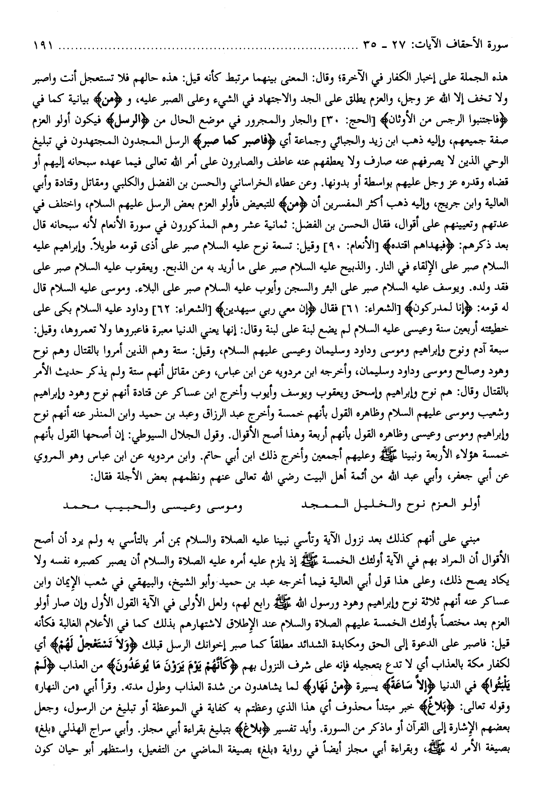 هذه الجملة على إخبار الكفار في الآخرة وقال: المعنى بينهما مرتبط كأنه قيل: هذه حالهم فلا تستعجل أنت واصبر ولا تخف إلا الله عز وجل، والعزم يطلق على الجد والاجتهاد في الشيء وعلى الصبر عليه، ومِنَ بيانية كما في فَاجْتَنِبُوا الرِّجْسَ مِنَ الْأَوْثانِ [الحج: 30] والجار والمجرور في موضع الحال من الرُّسُلِ فيكون أولو العزم صفة جميعهم، وإليه ذهب ابن زيد والجبائي وجماعة أي فَاصْبِرْ كَما صَبَرَ الرسل المجدون المجتهدون في تبليغ الوحي الذين لا يصرفهم عنه صارف ولا يعطفهم عنه عاطف والصابرون على أمر الله تعالى فيما عهده سبحانه إليهم أو قضاه وقدره عز وجل عليهم بواسطة أو بدونها. وعن عطاء الخراساني والحسن بن الفضل والكلبي ومقاتل وقتادة وأبي العالية وابن جريج، وإليه ذهب أكثر المفسرين أن مِنَ للتبعيض فأولو العزم بعض الرسل عليهم السلام، واختلف في عدتهم وتعيينهم على أقوال، فقال الحسن بن الفضل: ثمانية عشر وهم المذكورون في سورة الأنعام لأنه سبحانه قال بعد ذكرهم: فَبِهُداهُمُ اقْتَدِهْ [الأنعام: 90] وقيل: تسعة نوح عليه السلام صبر على أذى قومه طويلا. وإبراهيم عليه السلام صبر على الإلقاء في النار. والذبيح عليه السلام صبر على ما أريد به من الذبح. ويعقوب عليه السلام صبر على فقد ولده. ويوسف عليه السلام صبر على البئر والسجن وأيوب عليه السلام صبر على البلاء. وموسى عليه السلام قال له قومه: إِنَّا لَمُدْرَكُونَ [الشعراء: 61] فقال إِنَّ مَعِي رَبِّي سَيَهْدِينِ [الشعراء: 62] وداود عليه السلام بكى على خطيئته أربعين سنة وعيسى عليه السلام لم يضع لبنة على لبنة وقال: إنها يعني الدنيا معبرة فاعبروها ولا تعمروها، وقيل: