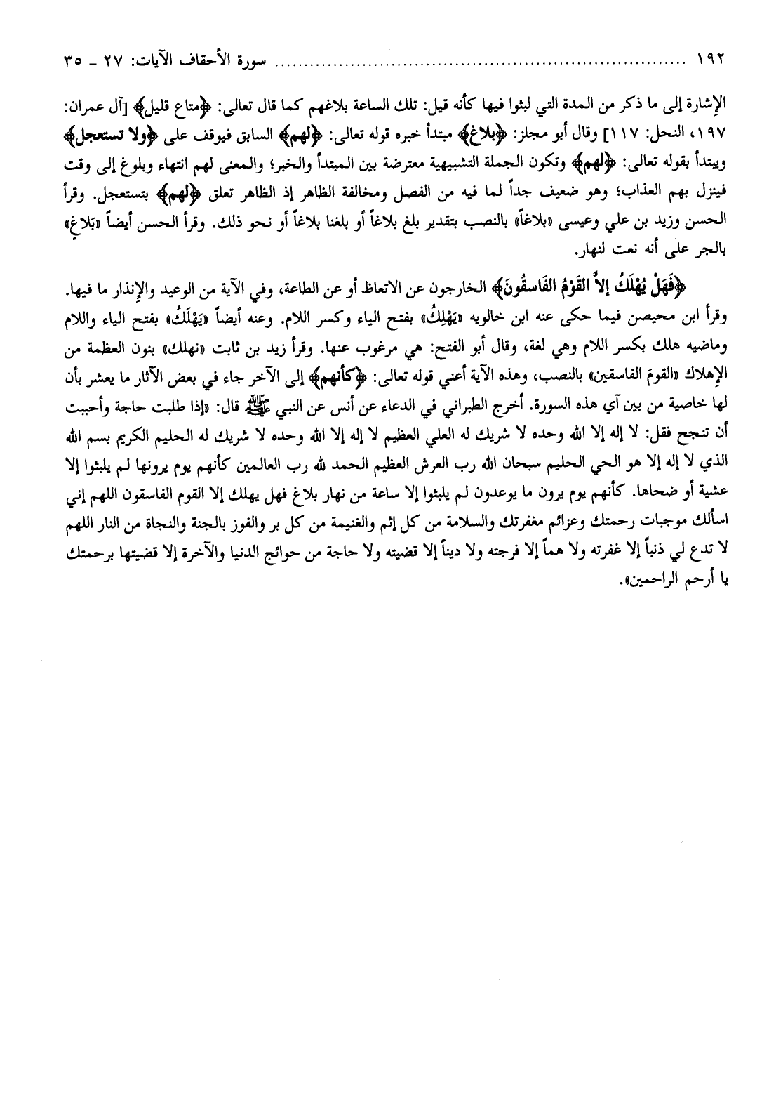 197، النحل: 117] وقال أبو مجلز: بَلاغٌ مبتدأ خبره قوله تعالى: لَهُمْ السابق فيوقف على وَلا تَسْتَعْجِلْ ويبتدأ بقوله تعالى: لَهُمْ وتكون الجملة التشبيهية معترضة بين المبتدأ والخبر والمعنى لهم انتهاء وبلوغ إلى وقت فينزل بهم العذاب وهو ضعيف جدا لما فيه من الفصل ومخالفة الظاهر إذ الظاهر تعلق لَهُمْ بتستعجل. وقرأ الحسن وزيد بن علي وعيسى «بلاغا» بالنصب بتقدير بلغ بلاغا أو بلغنا بلاغا أو نحو ذلك. وقرأ الحسن أيضا «بلاغ» بالجر على أنه نعت لنهار.
