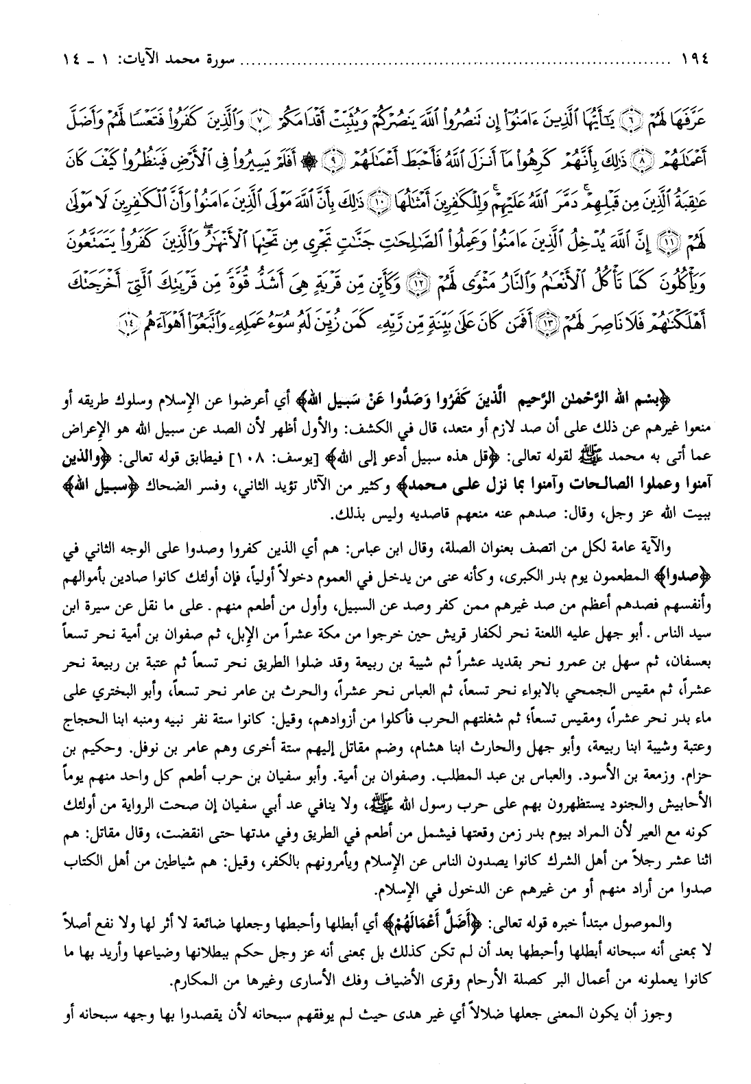 بِسْمِ اللَّهِ الرَّحْمنِ الرَّحِيمِ الَّذِينَ كَفَرُوا وَصَدُّوا عَنْ سَبِيلِ اللَّهِ أي أعرضوا عن الإسلام وسلوك طريقه أو منعوا غيرهم عن ذلك على أن صد لازم أو متعد، قال في الكشف: والأول أظهر لأن الصد عن سبيل الله هو الإعراض عما أتى به محمد صلّى الله عليه وسلّم لقوله تعالى: قُلْ هذِهِ سَبِيلِي أَدْعُوا إِلَى اللَّهِ [يوسف: 108] فيطابق قوله تعالى: وَالَّذِينَ آمَنُوا وَعَمِلُوا الصَّالِحاتِ وَآمَنُوا بِما نُزِّلَ عَلى مُحَمَّدٍ وكثير من الآثار تؤيد الثاني، وفسر الضحاك سَبِيلِ اللَّهِ ببيت الله عز وجل، وقال: صدهم عنه منعهم قاصديه وليس بذلك.