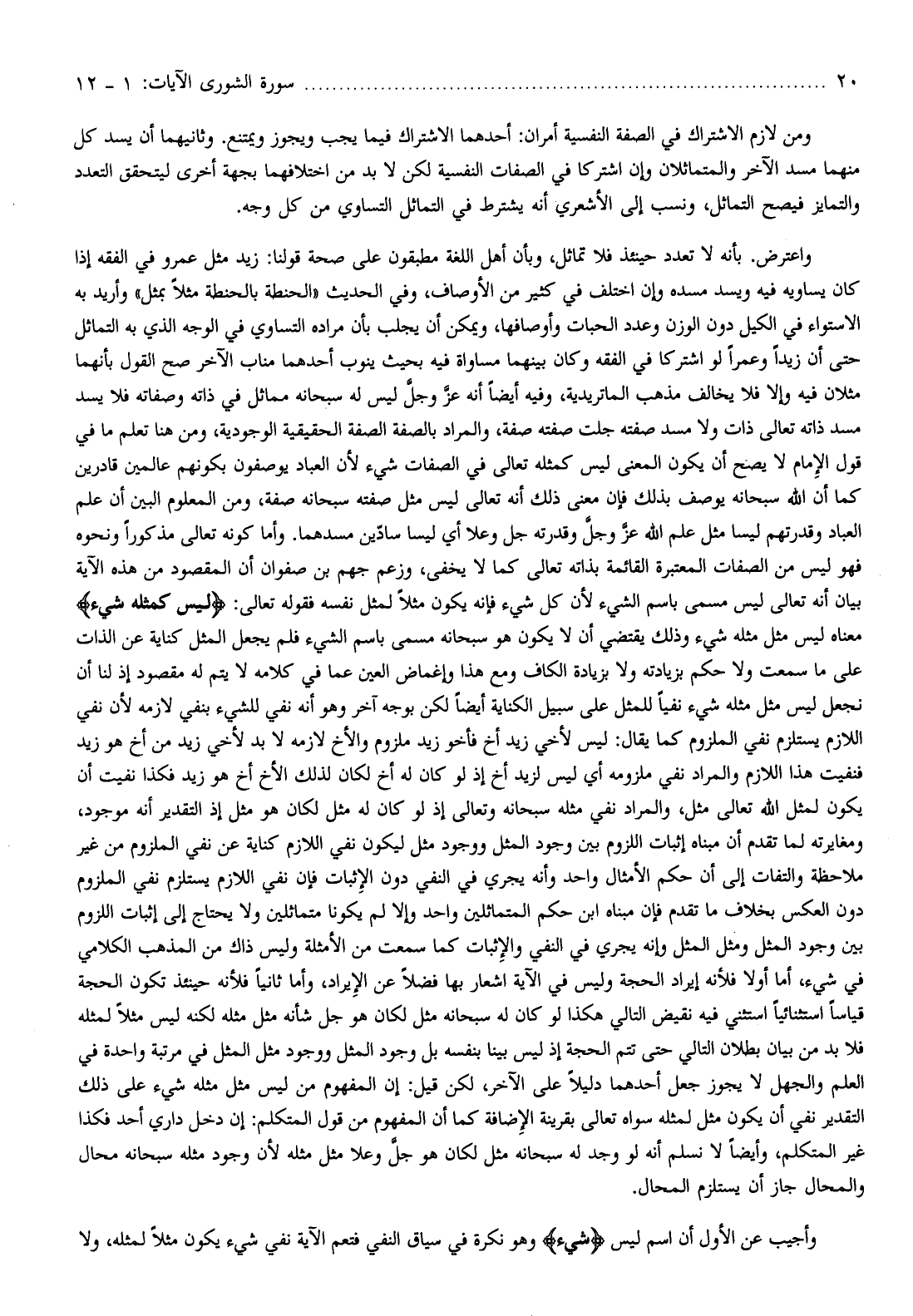 وأريد به الاستواء في الكيل دون الوزن وعدد الحبات وأوصافها، ويمكن أن يجلب بأن مراده التساوي في الوجه الذي به التماثل حتى أن زيدا وعمرا لو اشتركا في الفقه وكان بينهما مساواة فيه بحيث ينوب أحدهما مناب الآخر صح القول بأنهما مثلان فيه وإلا فلا يخالف مذهب الماتريدية، وفيه أيضا أنه عزّ وجلّ ليس له سبحانه مماثل في ذاته وصفاته فلا يسد مسد ذاته تعالى ذات ولا مسد صفته جلت صفته صفة، والمراد بالصفة الصفة الحقيقية الوجودية، ومن هنا تعلم ما في قول الإمام لا يصح أن يكون المعنى ليس كمثله تعالى في الصفات شيء لأن العباد يوصفون بكونهم عالمين قادرين كما أن الله سبحانه يوصف بذلك فإن معنى ذلك أنه تعالى ليس مثل صفته سبحانه صفة، ومن المعلوم البين أن علم العباد وقدرتهم ليسا مثل علم الله عزّ وجلّ وقدرته جل وعلا أي ليسا سادّين مسدهما. وأما كونه تعالى مذكورا ونحوه فهو ليس من الصفات المعتبرة القائمة بذاته تعالى كما لا يخفى، وزعم جهم بن صفوان أن المقصود من هذه الآية بيان أنه تعالى ليس مسمى باسم الشيء لأن كل شيء فإنه يكون مثلا لمثل نفسه فقوله تعالى: لَيْسَ كَمِثْلِهِ شَيْءٌ معناه ليس مثل مثله شيء وذلك يقتضي أن لا يكون هو سبحانه مسمى باسم الشيء فلم يجعل المثل كناية عن الذات على ما سمعت ولا حكم بزيادته ولا بزيادة الكاف ومع هذا وإغماض العين عما في كلامه لا يتم له مقصود إذ لنا أن نجعل ليس مثل مثله شيء نفيا للمثل على سبيل الكناية أيضا لكن بوجه آخر وهو أنه نفي للشيء بنفي لازمه لأن نفي اللازم يستلزم نفي الملزوم كما يقال: ليس لأخي زيد أخ فأخو زيد ملزوم والأخ لازمه لا بد لأخي زيد من أخ هو زيد فنفيت هذا اللازم والمراد نفي ملزومه أي ليس لزيد أخ إذ لو كان له أخ لكان لذلك الأخ أخ هو زيد فكذا نفيت أن يكون لمثل الله تعالى مثل، والمراد نفي مثله سبحانه وتعالى إذ لو كان له مثل لكان هو مثل إذ التقدير أنه موجود، ومغايرته لما تقدم أن مبناه إثبات اللزوم بين وجود المثل ووجود مثل ليكون نفي اللازم كناية عن نفي الملزوم من غير ملاحظة والتفات إلى أن حكم الأمثال واحد وأنه يجري في النفي دون الإثبات فإن نفي اللازم يستلزم نفي الملزوم دون العكس بخلاف ما تقدم فإن مبناه ابن حكم المتماثلين واحد وإلا لم يكونا متماثلين ولا يحتاج إلى إثبات اللزوم بين وجود المثل ومثل المثل وإنه يجري في النفي والإثبات كما سمعت من الأمثلة وليس ذاك من المذهب الكلامي في شيء، أما أولا فلأنه إيراد الحجة وليس في الآية اشعار بها فضلا عن الإيراد، وأما ثانيا فلأنه حينئذ تكون الحجة قياسا استثنائيا استثني فيه نقيض التالي هكذا لو كان له سبحانه مثل لكان هو جل شأنه مثل مثله لكنه ليس مثلا لمثله فلا بد من بيان بطلان التالي حتى تتم الحجة إذ ليس بينا بنفسه بل وجود المثل ووجود مثل المثل في مرتبة واحدة في العلم والجهل لا يجوز جعل أحدهما دليلا على الآخر، لكن قيل: إن المفهوم من ليس مثل مثله شيء على ذلك التقدير نفي أن يكون مثل لمثله سواه تعالى بقرينة الإضافة كما أن المفهوم من قول المتكلم: إن دخل داري أحد فكذا غير المتكلم، وأيضا لا نسلم أنه لو وجد له سبحانه مثل لكان هو جلّ وعلا مثل مثله لأن وجود مثله سبحانه محال والمحال جاز أن يستلزم المحال.